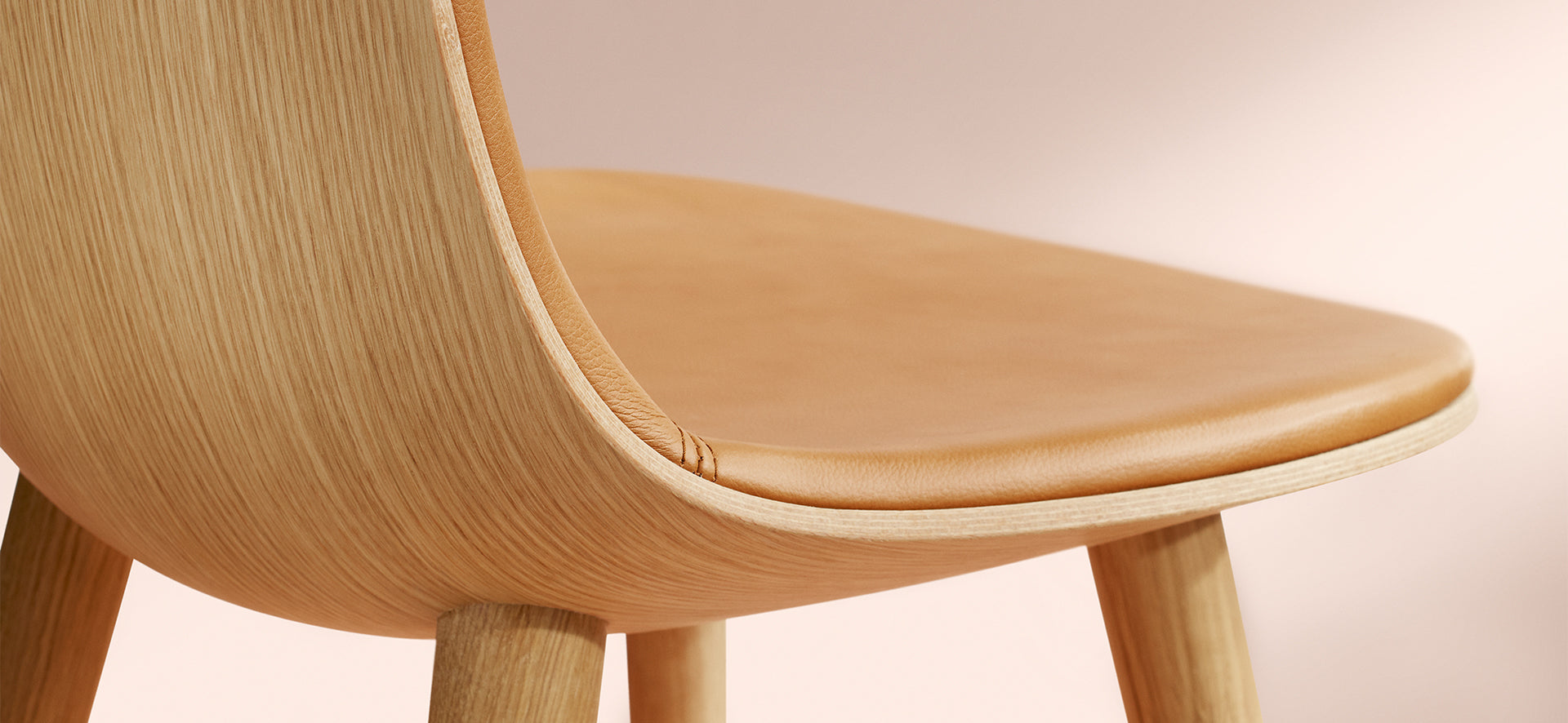 Det 3D formpressede finér giver spisebordsstolen en smuk bøjet og gennemtænkt bagside. Og den bløde inderside gør spisebordsstolen behagelig at sidde i længe ad gangen. EVA SOLO ABALONE er således organisk i sin form udenpå og blød indeni ligesom den asiatiske musling med samme navn. Spisebordsstolen er designet, så den ikke fylder så meget ved spisebordet, hvilket giver masser af plads omkring bordet.