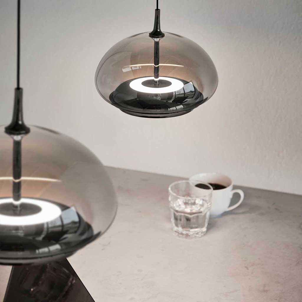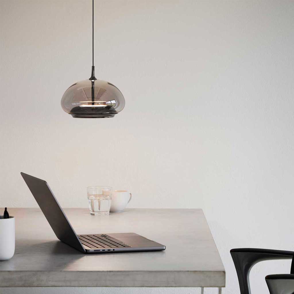 Glassets dimensioner på 12 cm i højde og 20 cm i diameter og de gunmetal sorte detaljer gør Avalon til en iøjnefaldende, men subtil tilføjelse. Lyset spredes både nedad og op gennem det røgede glas, hvilket giver en harmonisk og dæmpet belysning, der fremhæver rummets indretning og skaber en behagelig stemning.