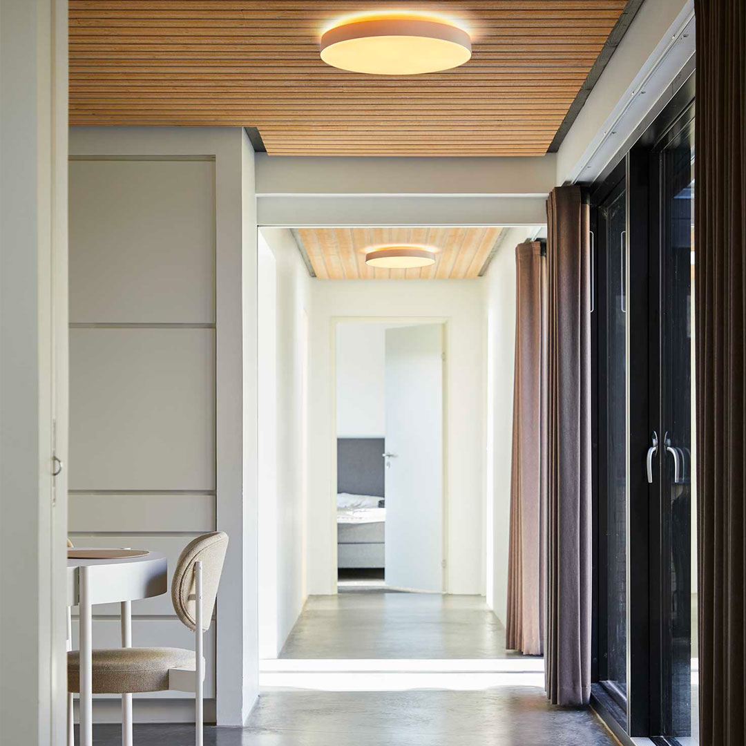 Lampen er designet med en let afstand til loftet eller væggen, hvilket skaber en smuk backlight-effekt og en glødende lysring, der fremhæver den sofistikerede farve på en subtil måde. Den indbyggede LED-lyskilde på 60W udsender et varmt 2700K lys, som kan dæmpes via triac-dæmpning for optimal fleksibilitet. Med en højde på 5,5 cm og en diameter på 36 cm er Avela Ø36 en elegant og funktionel løsning til alt fra gangarealer og soveværelser til stuer og kontorer. Den indbyggede driver (220-240V) gør installationen enkel, så lampen let kan integreres i ethvert rum, hvor stilfuld belysning ønskes.