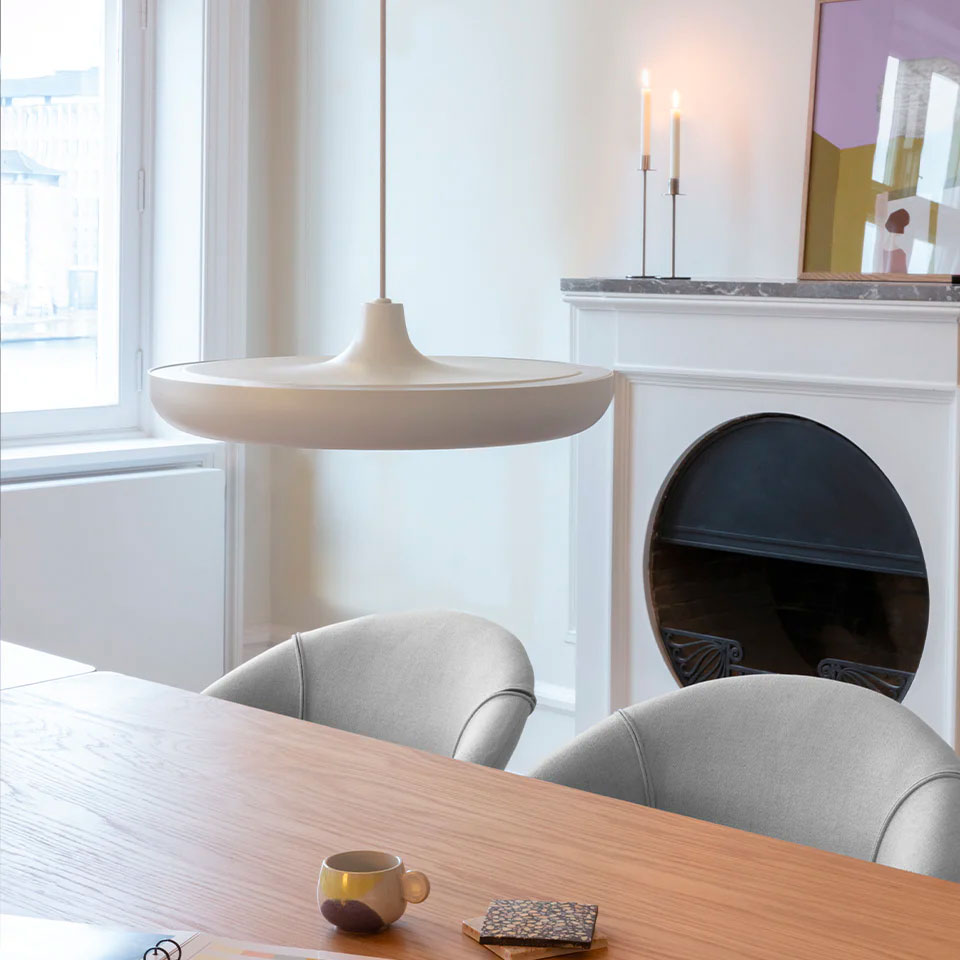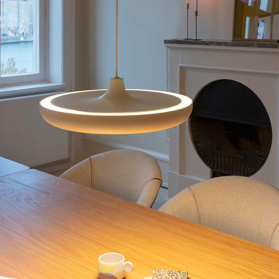 Smuk pendel fra danske Umage. Lampen er inspireret af Saturns ringe og har et indbygget LED-panel med diffusorer, der sikrer en blød belysning i rummet.