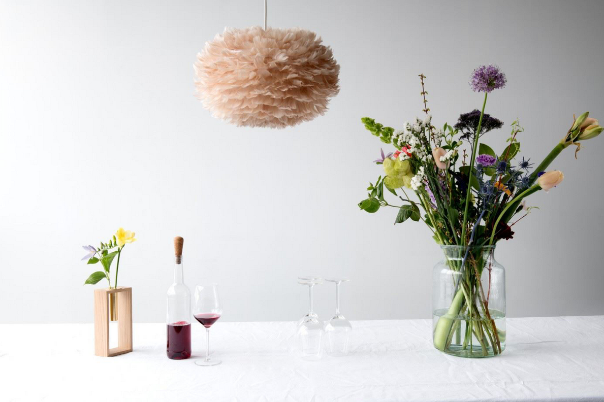 EOS er designet af Søren Ravn Christensen og giver et forfinet og feminint udtryk. Lampen består af hundredvis af påsatte gåsefjer, og giver et blødt og fyldigt lys. Lampen er overraskende nem at rengøre - du lader bare hårtørreren blæse støvet af fjerene. Skærmen kan bruges både til ophæng, bordstander og gulvstander.