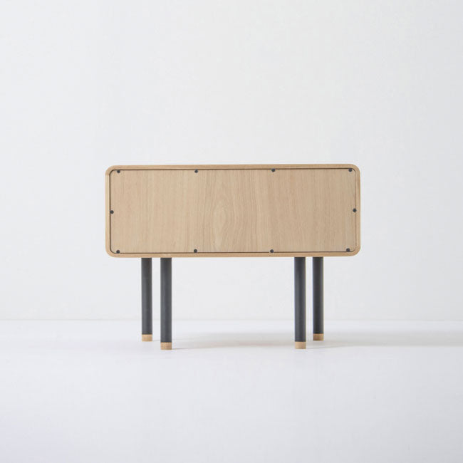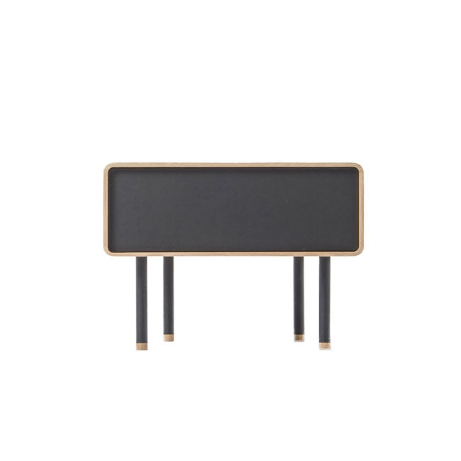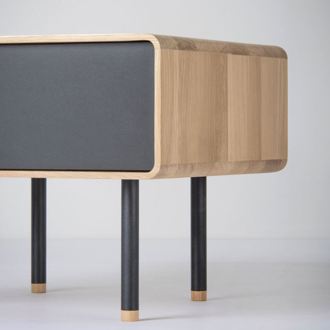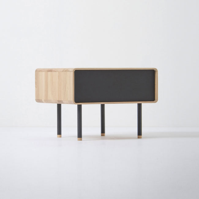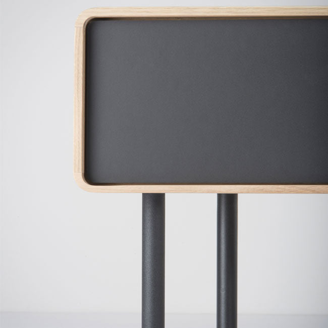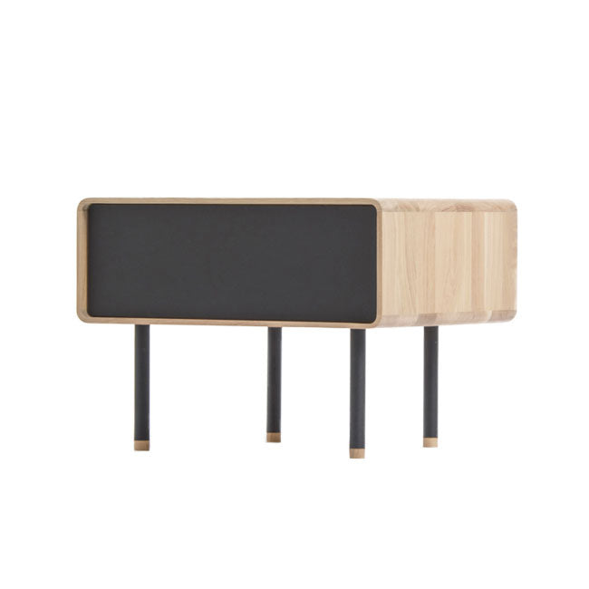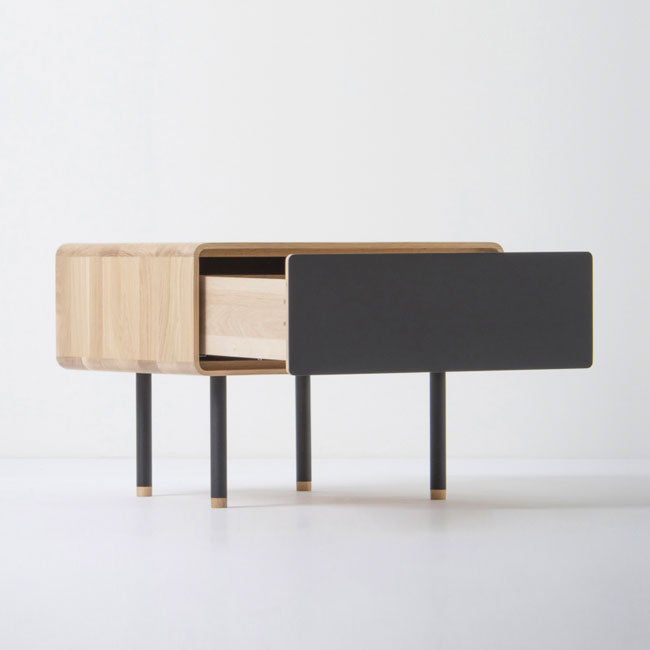 Fina Nightstand fra Gazzda er fremstillet i massiv eg med skuffefront i linoleum. Benene er fremstillet i sort pulverlakeret stål.