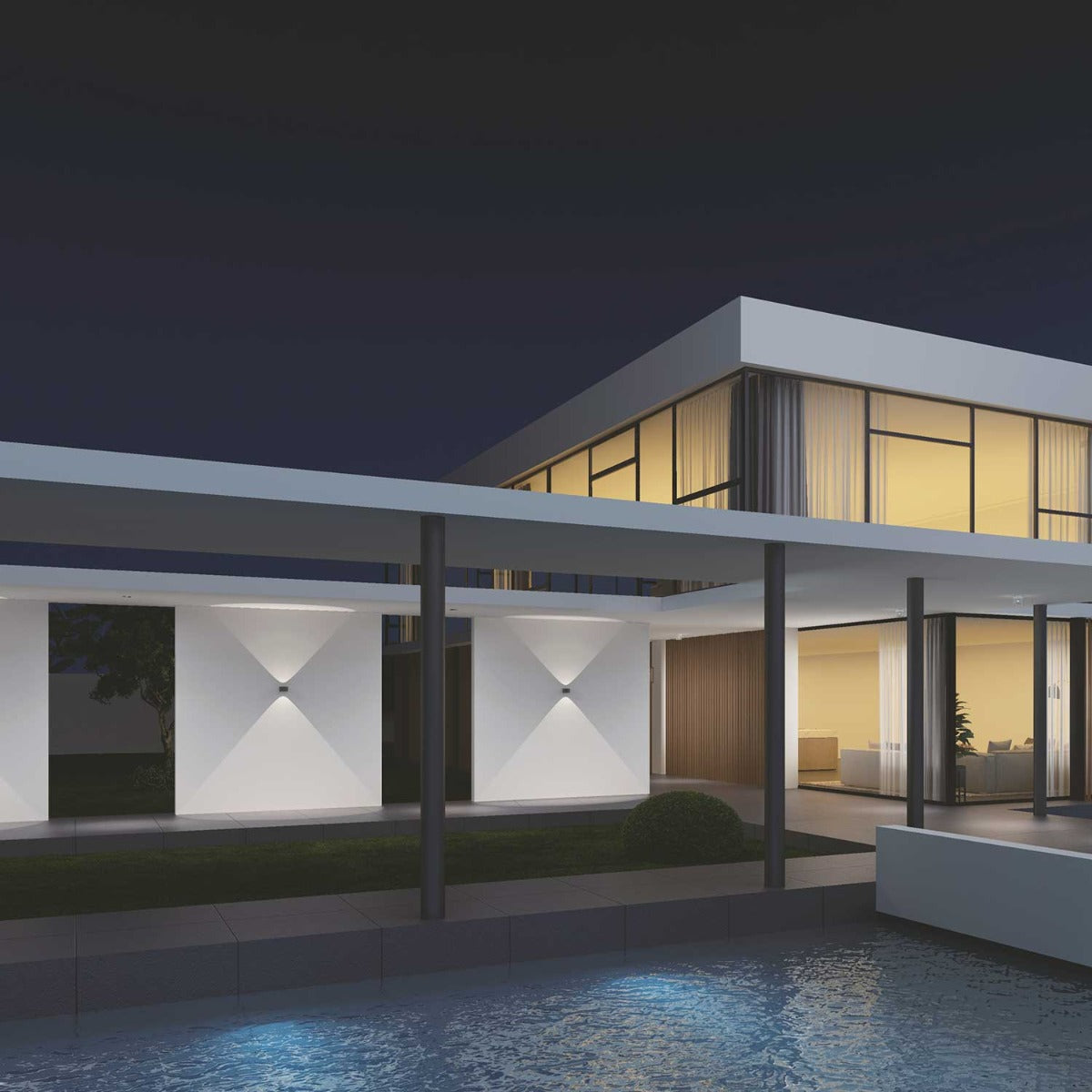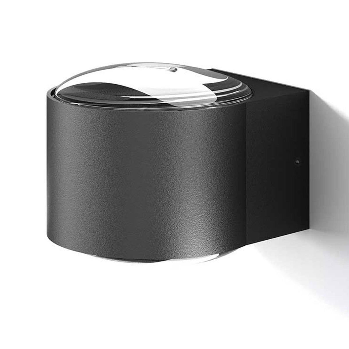 Lysets 100° strålevinkel opad- og nedadrettet giver et flot lysspil på væggen. Den har indbygget LED, er fremstillet i trykstøbt aluminium, og den fås i sort og hvid med en IP65 klassificering, der gør den god til udendørsbrug.