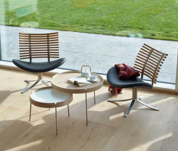 Gepard lænestolen fra Naver Collection fås i eg, ask, sort- eller hvidbejdset ask og valnød. Sædet er polstret med læder.