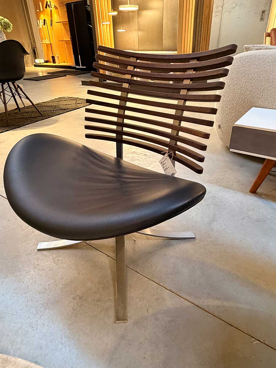 Med Gepard Lounge Stolen får du et møbel, der behersker kunsten at kombinere slank, skulpturel formgivning med sand siddekomfort. Designet af Henrik Lehm for Naver Collection, ligger stolens karakteristiske dampbøjede træsprosser i ryggen til grund for dens lette udtryk — og det tørre rustfri stålstel understreger en tidløs og nutidig æstetik.