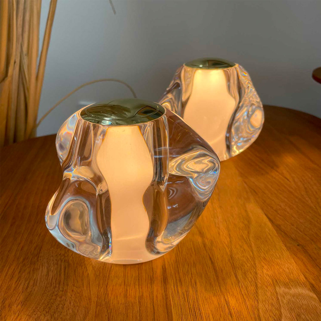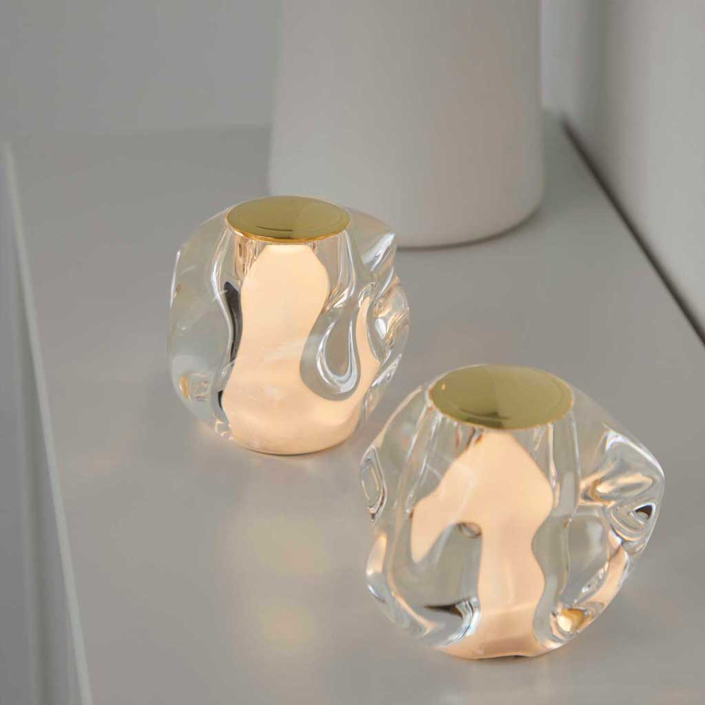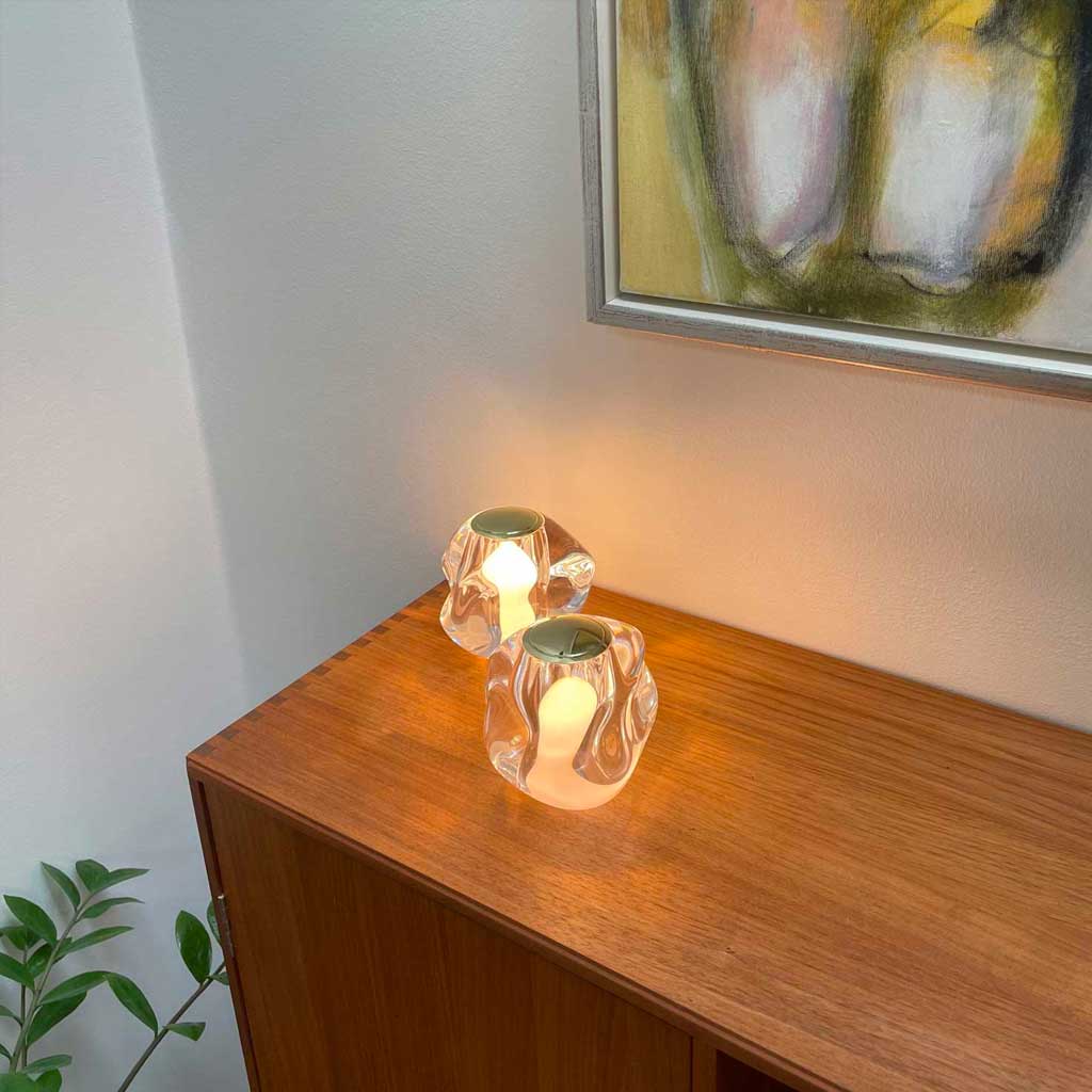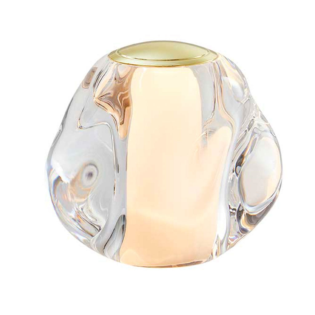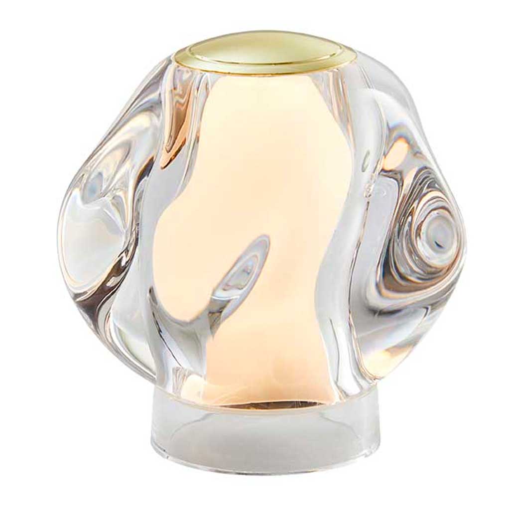 ICE BALL guld batteri bordlampen kombinerer funktionalitet og æstetik på en elegant måde. Lampens organiske form i klar akryl, fremstår som glas, hvilket tilføjer et sofistikeret udtryk. Guldfinishen på toppen giver et luksuriøst præg til lampen, hvilket gør den til et iøjnefaldende element i ethvert rum.