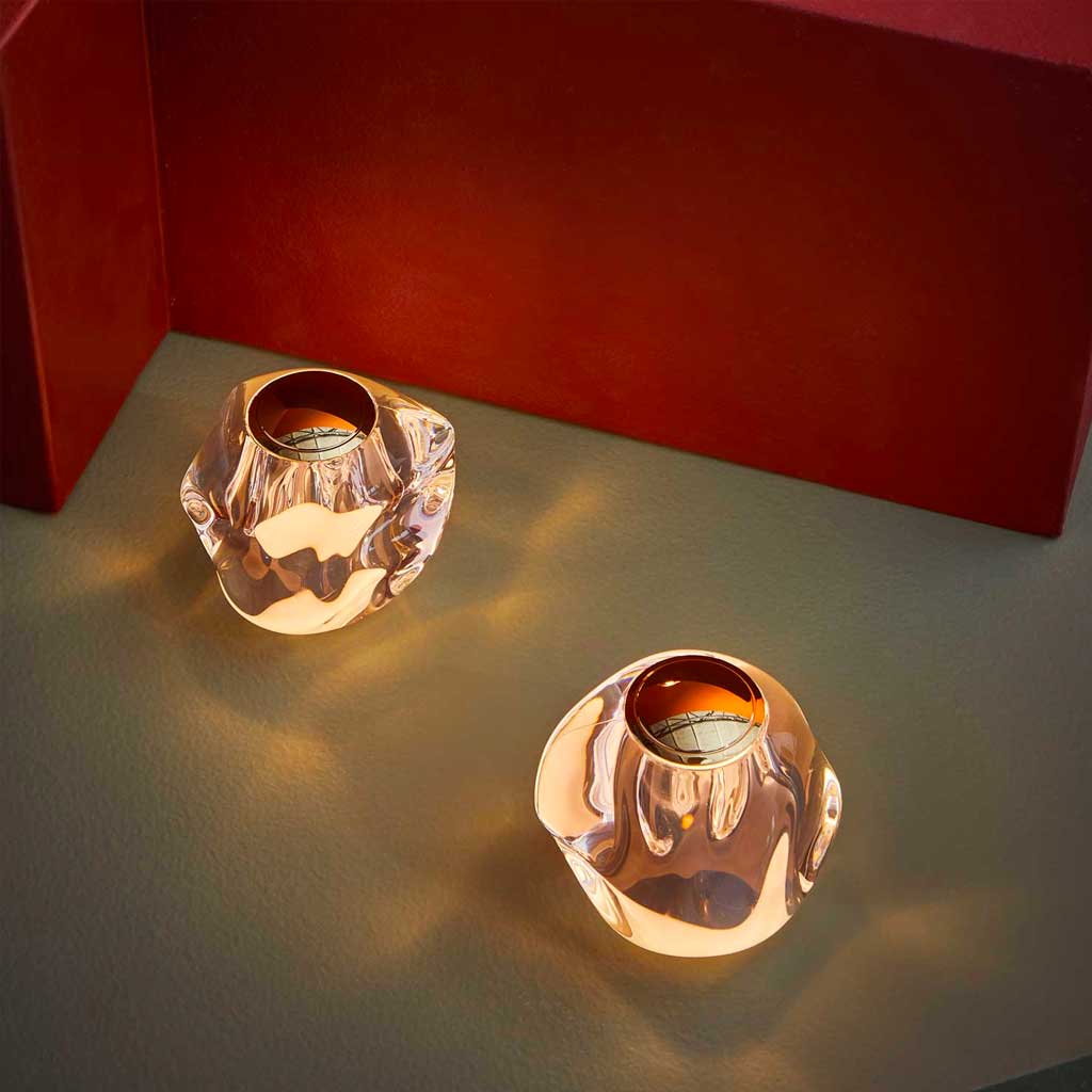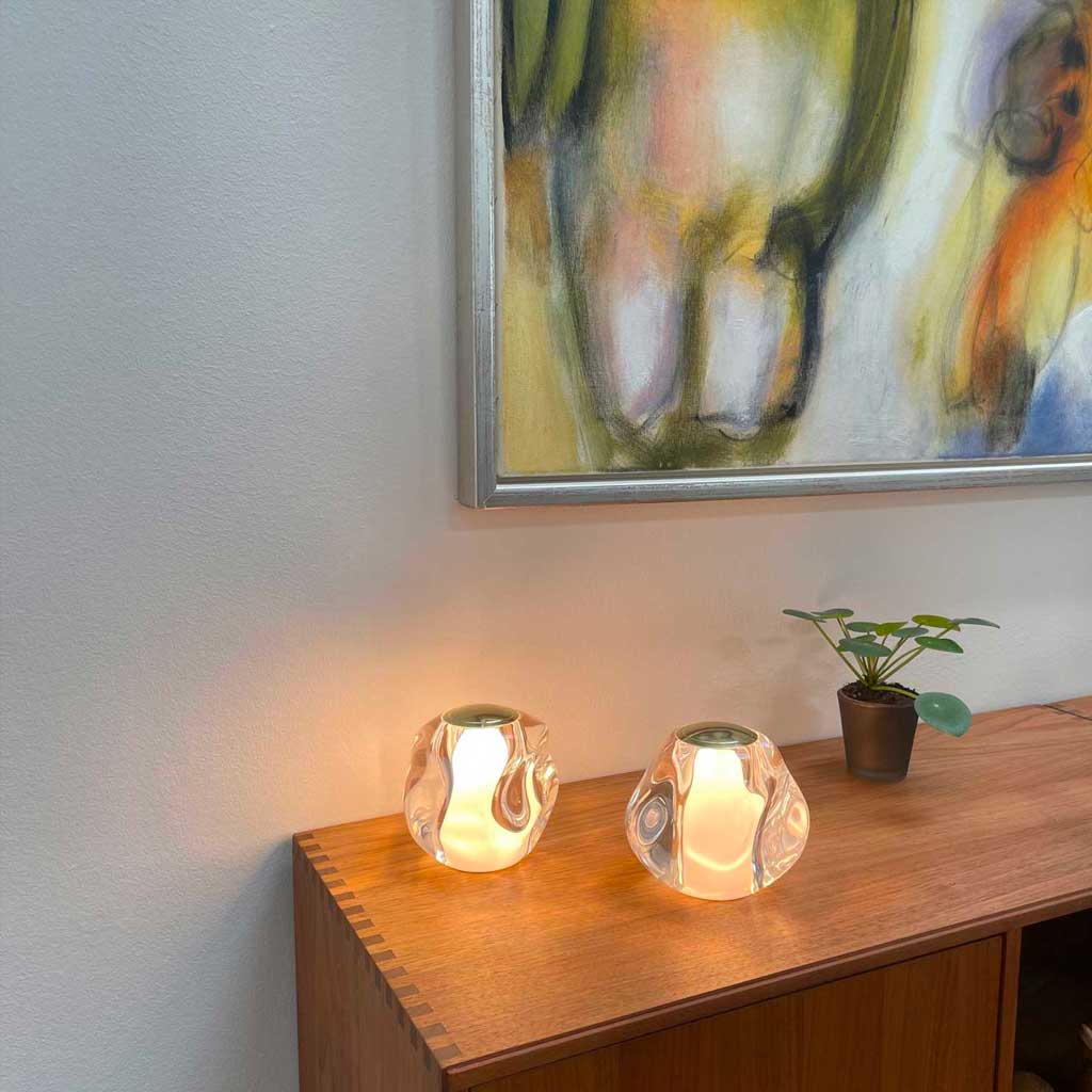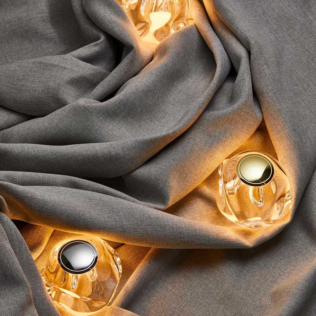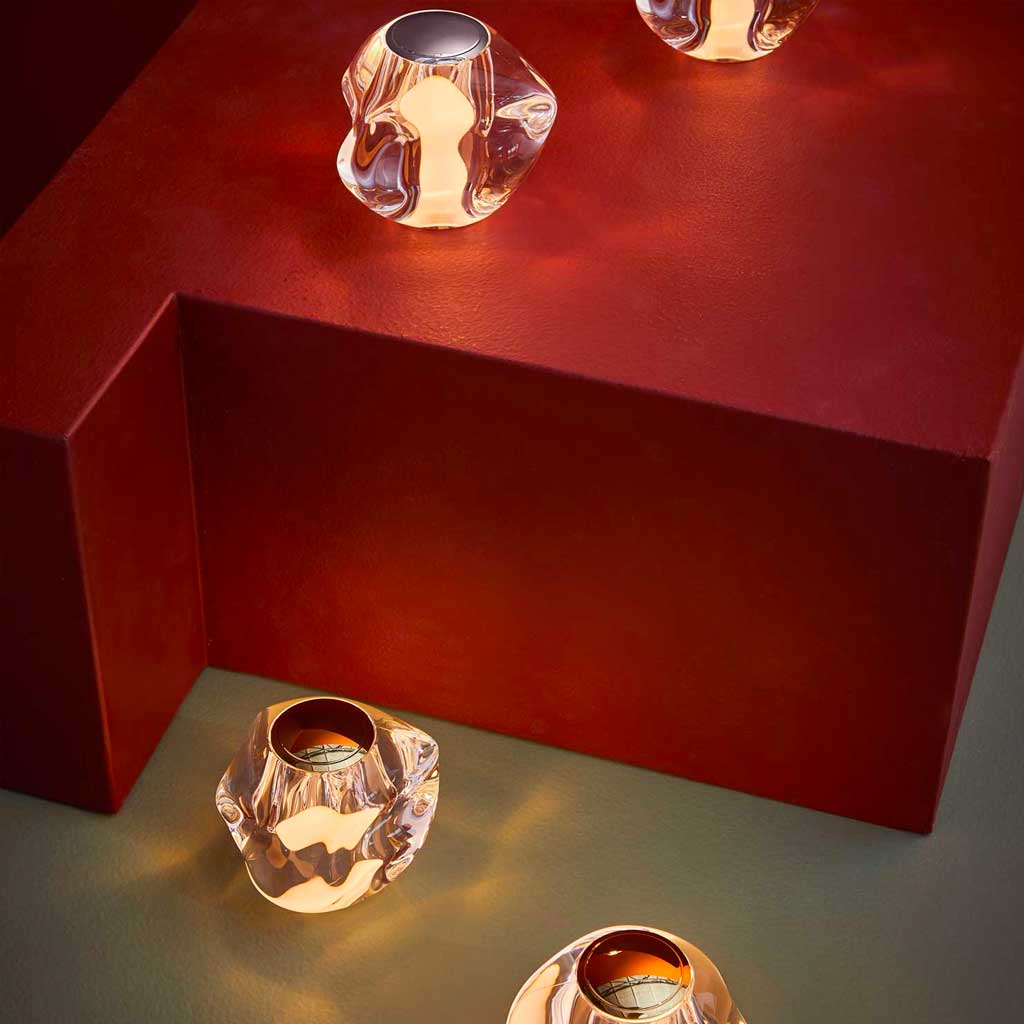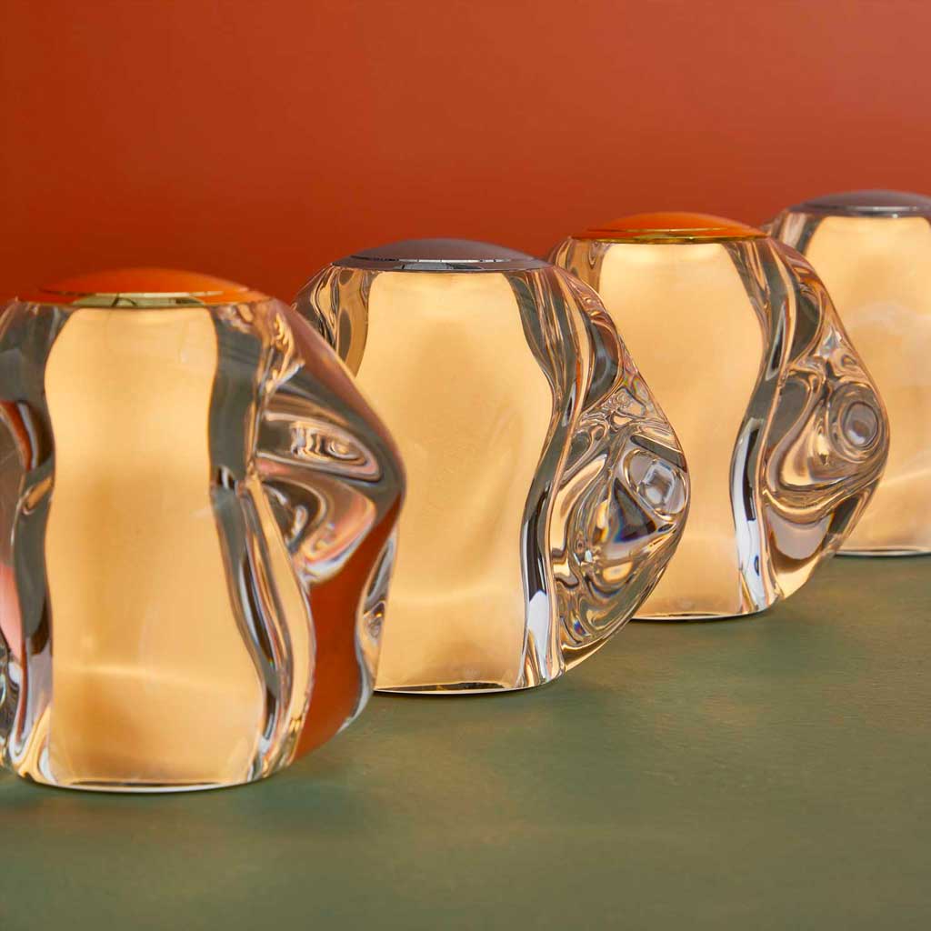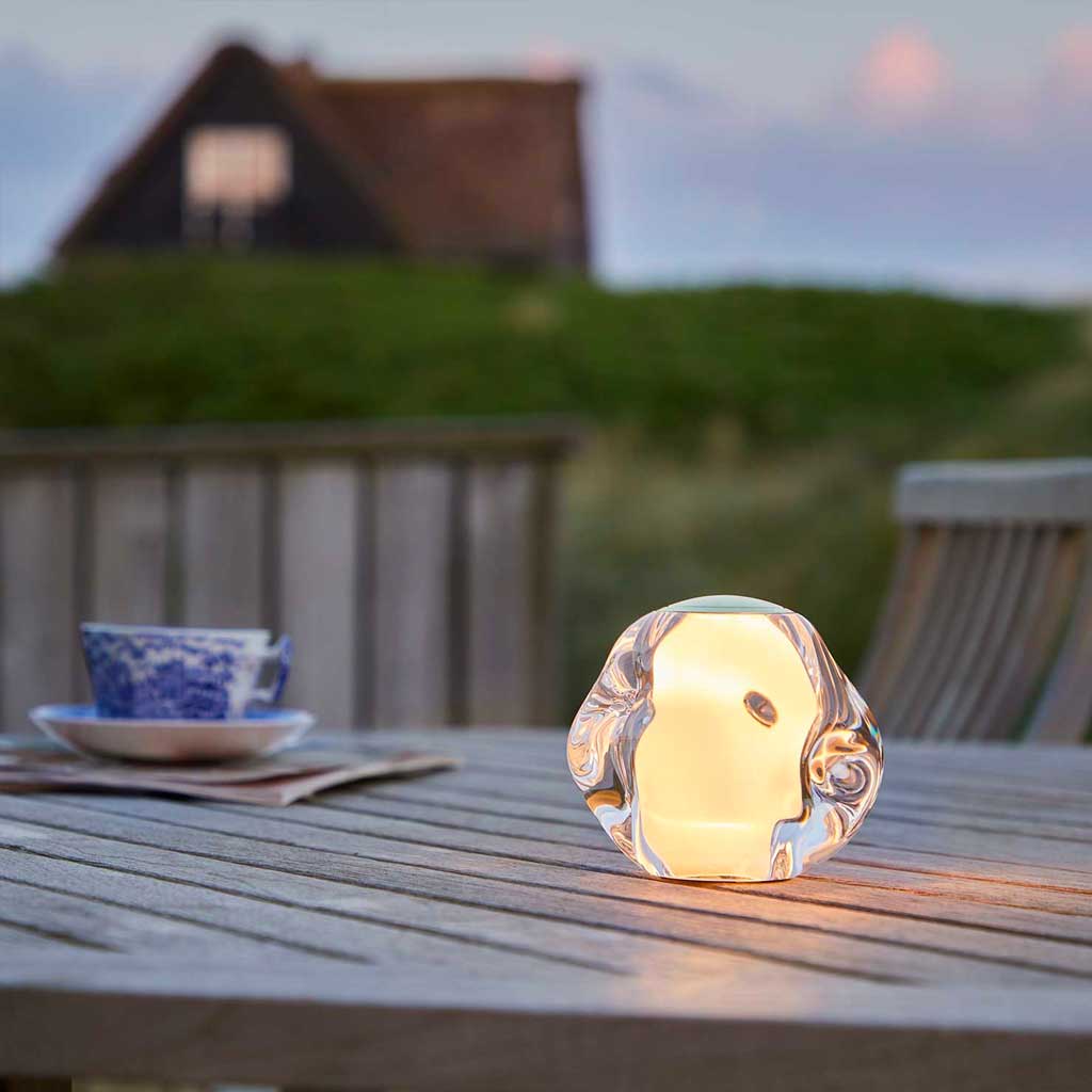 ICE BALL guld batteri bordlampen kombinerer funktionalitet og æstetik på en elegant måde. Lampens organiske form i klar akryl, fremstår som glas, hvilket tilføjer et sofistikeret udtryk. Guldfinishen på toppen giver et luksuriøst præg til lampen, hvilket gør den til et iøjnefaldende element i ethvert rum.