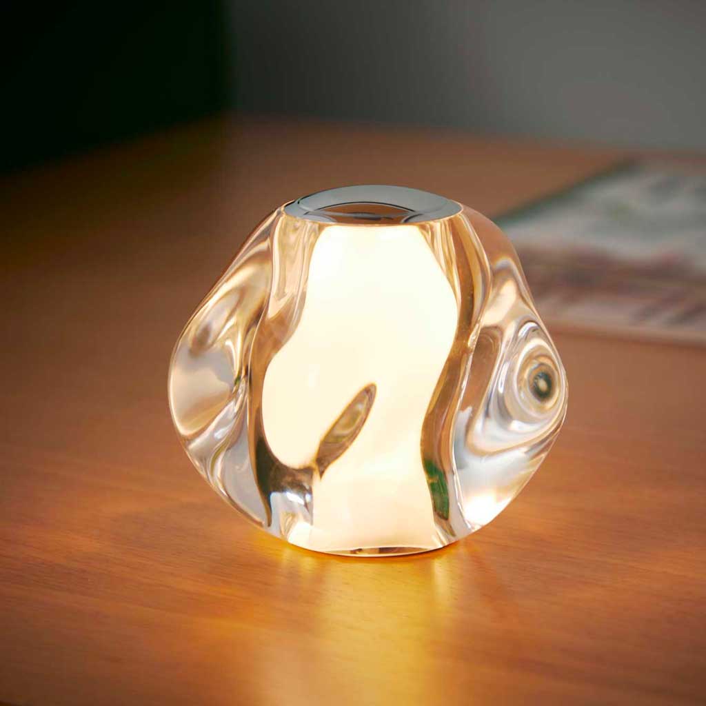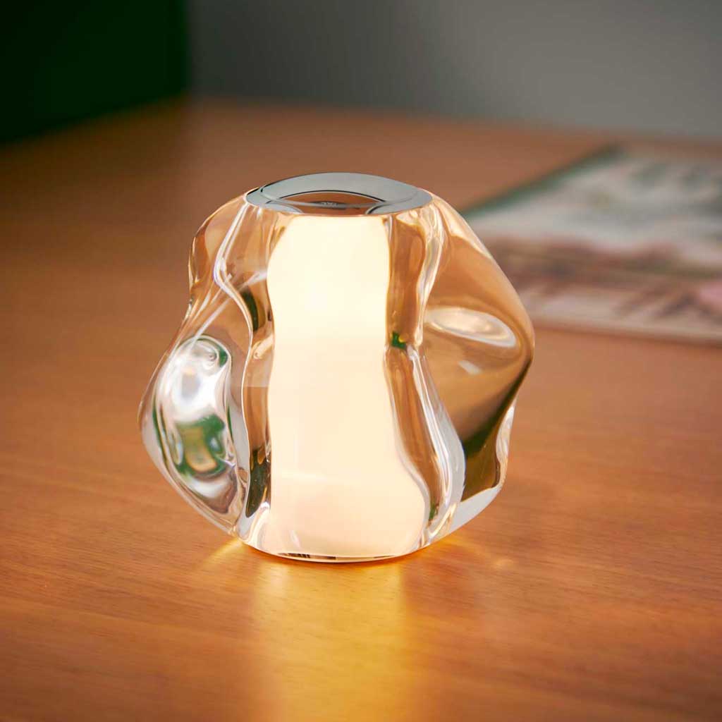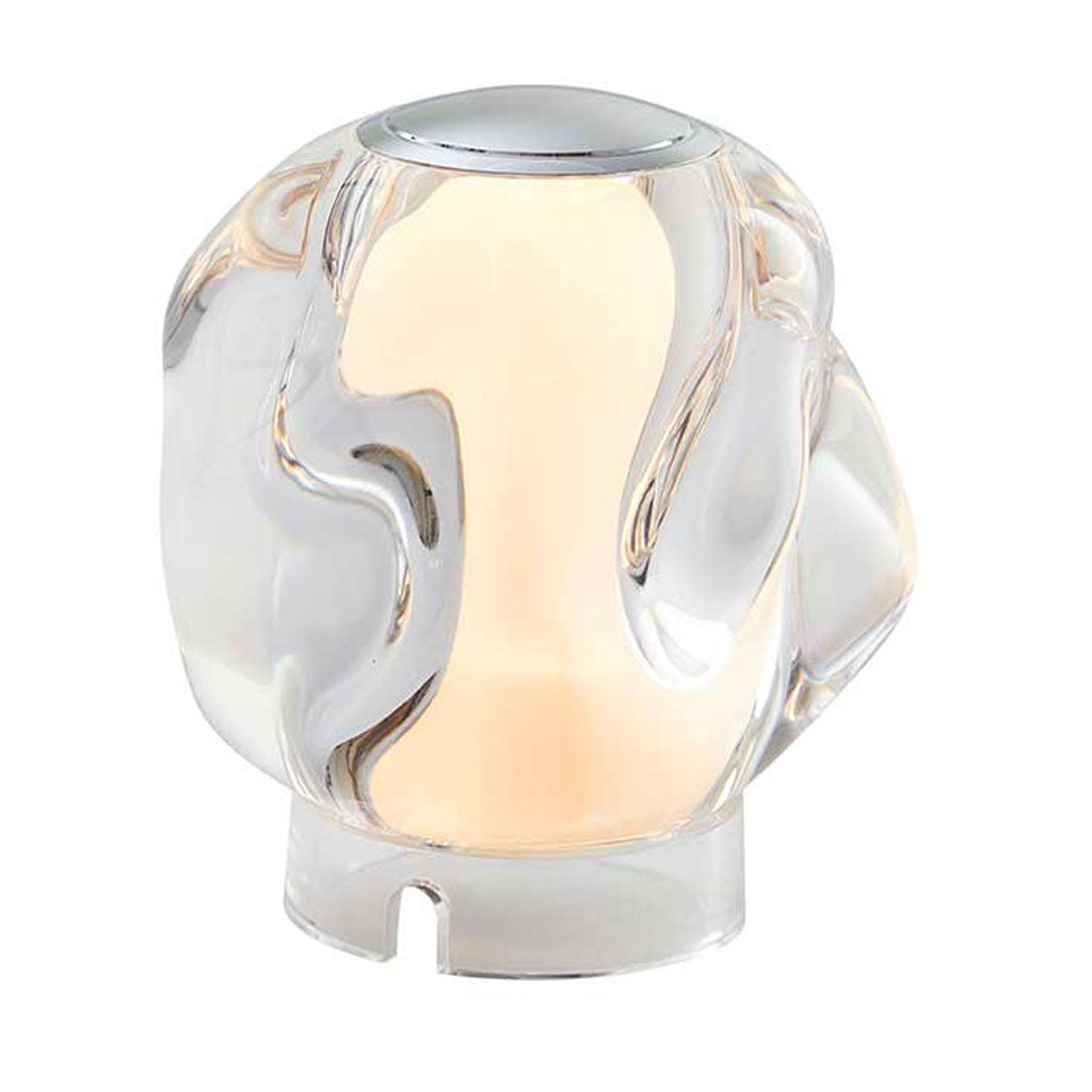 ICE BALL krom batteri bordlampen kombinerer stil og funktionalitet på en elegant måde. Med sin transparente form og kromplade på toppen, som giver mulighed for dæmpning, tilføjer denne lampe et strejf af moderne æstetik til ethvert rum. Dens organiske form i klar akryl, der fremstår som glas, giver den et unikt og sofistikeret look.