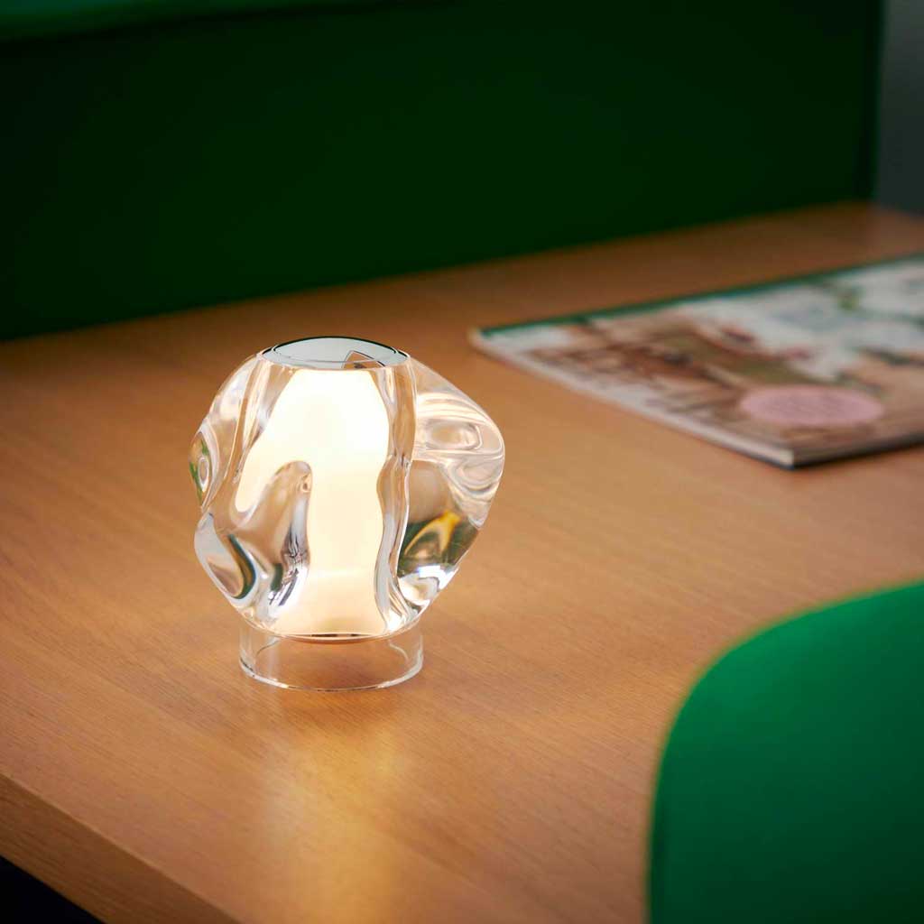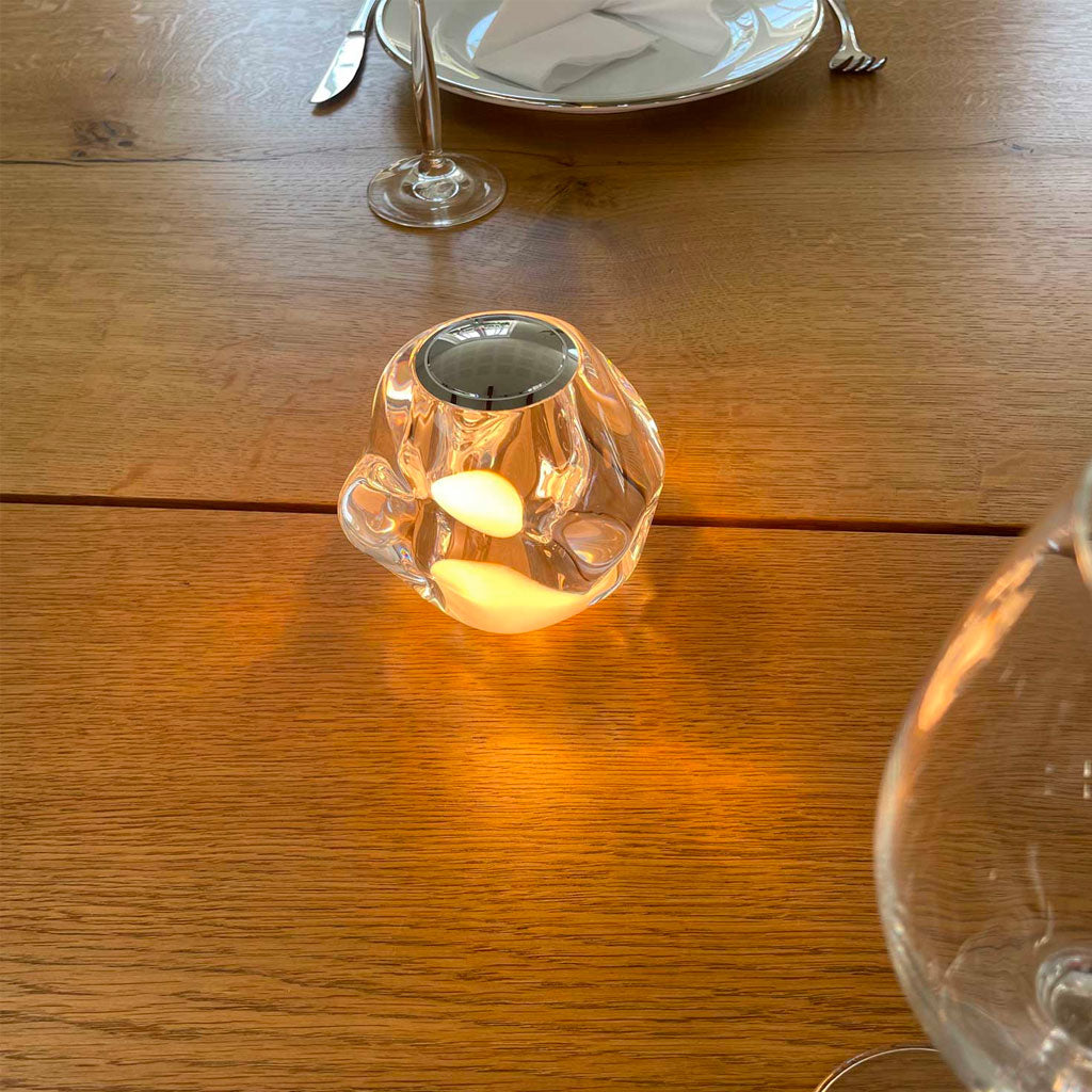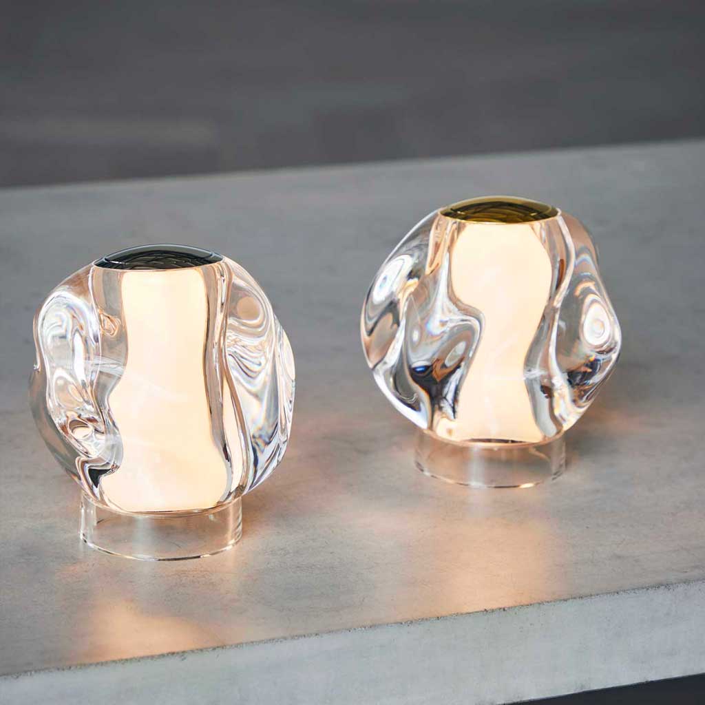 ICE BALL krom batteri bordlampen kombinerer stil og funktionalitet på en elegant måde. Med sin transparente form og kromplade på toppen, som giver mulighed for dæmpning, tilføjer denne lampe et strejf af moderne æstetik til ethvert rum. Dens organiske form i klar akryl, der fremstår som glas, giver den et unikt og sofistikeret look.