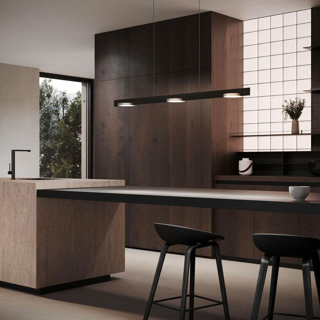 INLAY S LINEAR DISC pendel, er enkel og sofistikeret, men fyldt med attitude! Svævende fra to sorte ledninger fremhæves designets minimalistiske strømlinede form. Og kontrasterne og samspillet mellem de eksklusive materialer tiltrækker øjet. Denne INLAY S LINEAR DISC er udstyret med SWITCH TUNE, som giver dig mulighed for at vælge mellem 2700K og 3000K, og med sin arkitektoniske form, kaster den en jævn og blød belysning. INLAY LINEAR DISC er en del af INLAY-kollektionen, og netop denne variant er 1250 mm lang og med en finish i Matt Black Aluminium kombineret med Satin Silver.