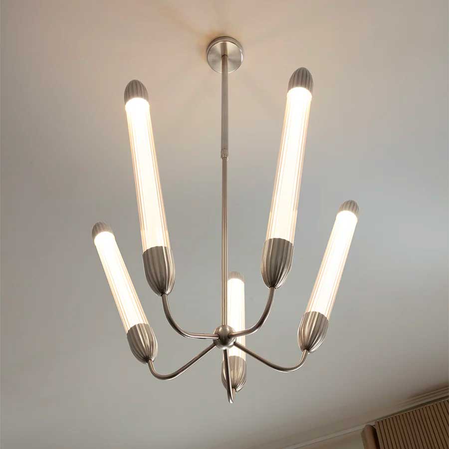 Lemon Squeeze penta hylder lys og design med sit karakteristiske riflede glas, skulpturelle metaldetaljer og referencer til klassiske lysekroner. Den unikke glasstruktur fanger lyset, mens en diffuser i midten af hvert lystube sikrer blød og jævn belysning, der skaber en indbydende stemning til enhver lejlighed.