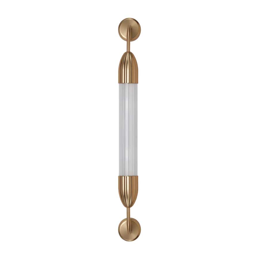 Lemon Squeeze væglampen single vækker nostalgisk charme med sin kombination af riflede glas og skulpturelle metaldetaljer, der forener moderne æstetik med elegante referencer til fortiden. Den strukturerede glasoverflade fanger lyset smukt, mens den indbyggede diffuser sikrer en blid og jævn belysning, der skaber en rolig og harmonisk atmosfære.
