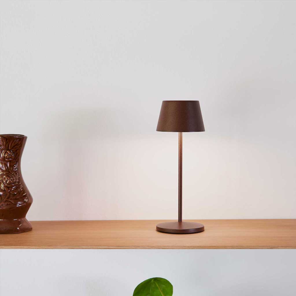 Modi Micro Corten er en batteridrevet mini-bordlampe i aluminium med klassisk skærm. Modi Micro er skabt i et elegant design, og med sin smukke, stålrøde corten-farve er det en bordlampe, som passer godt ind i mange indretninger og rum.