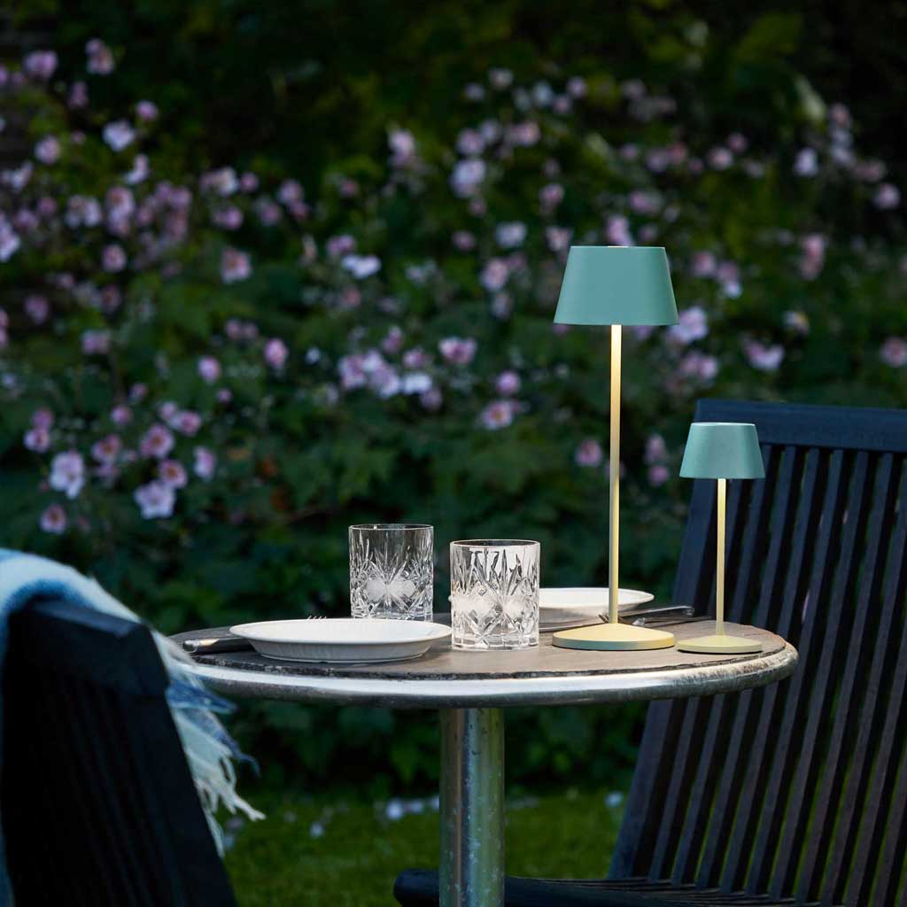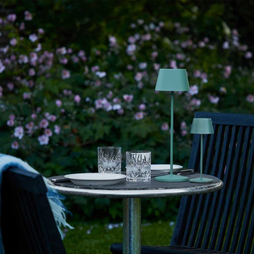 Modi Micro Grøngrå er en lille bordlampe på batteri, der er fremstillet i aluminium med klassisk lampeskærm. Modi Micro har et elegant design, der passer rigtig godt til mange forskellige miljøer og indretningsstile. Bordlampen har desuden IP65-tætningsgrad, så den kan bruges som udelampe.