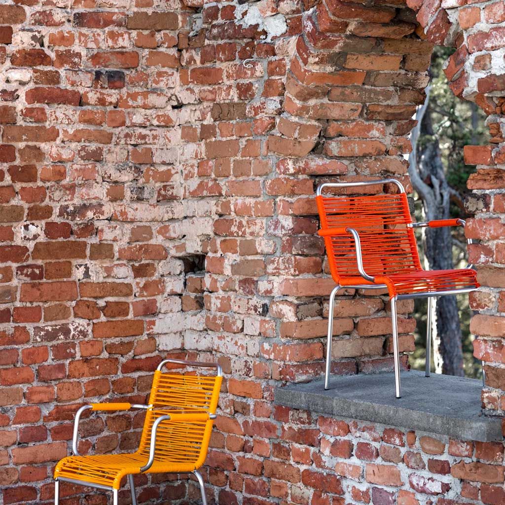 Fiam Mya er en elegant havestol med et harmonisk design – praktisk, stabelbar og let at håndtere. Designet af Ennio Favagrossa har Mya en let aluminiumsramme, mens sædet og armlænene er håndflettet med PVC-snore, også kendt som "spaghetti".