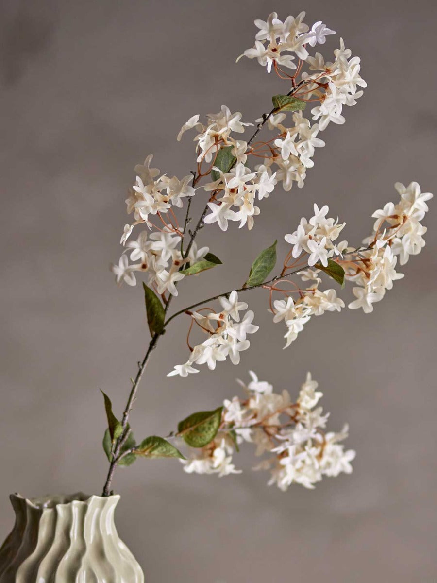 Myrtle Kunstig Stilk fra Bloomingville har lette, hvide blomster og grønne blade, som tilføjer et feminint touch til enhver indretning. Stilken kan nydes alene som et iøjnefaldende element i rummet eller kombineres med andre kunstige grene for at skabe en smuk buket. Før brug kan du med fordel forme stilken, for at frembringe dens naturlige udseende og tilpasse den til din personlige indretning.