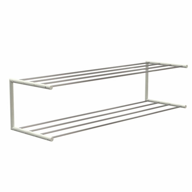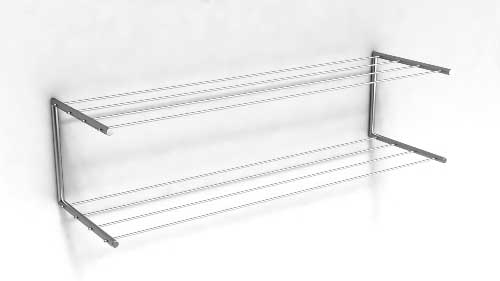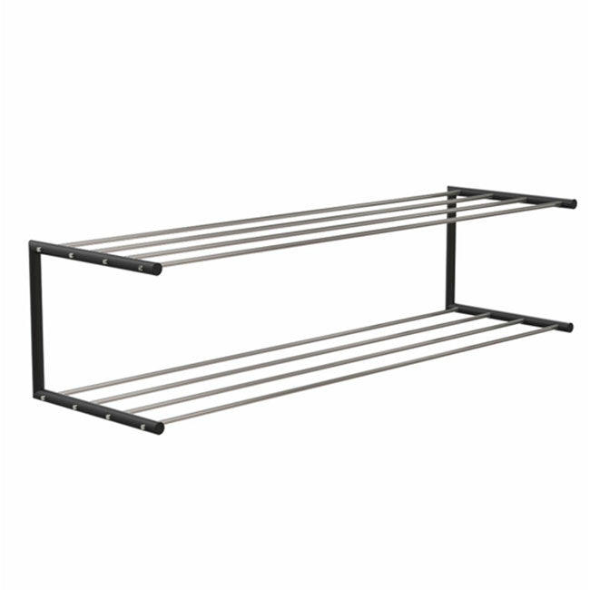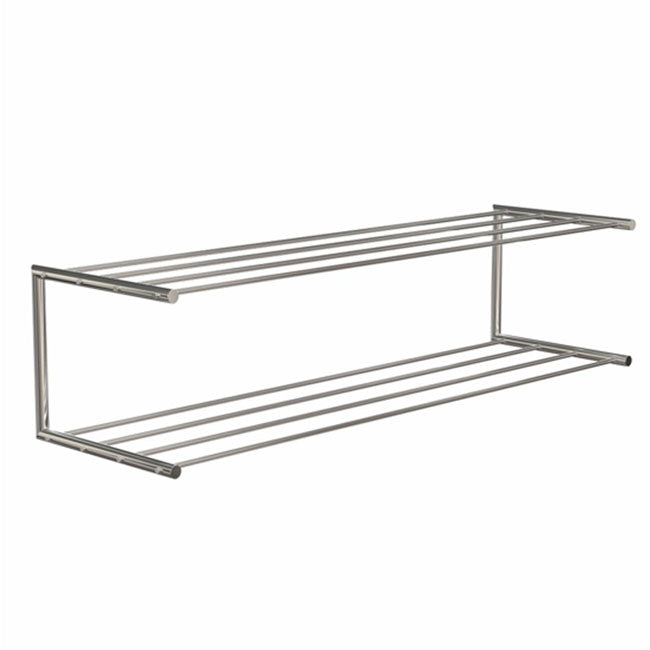 Frost Nova skohylde 2 fås i poleret og børstet stål samt i en version i poleret stål med hvide vanger.