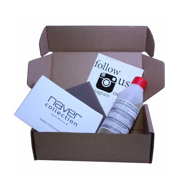Dette plejesæt består både af naturolie til oliebehandlede møbler samt en slibesvamp.