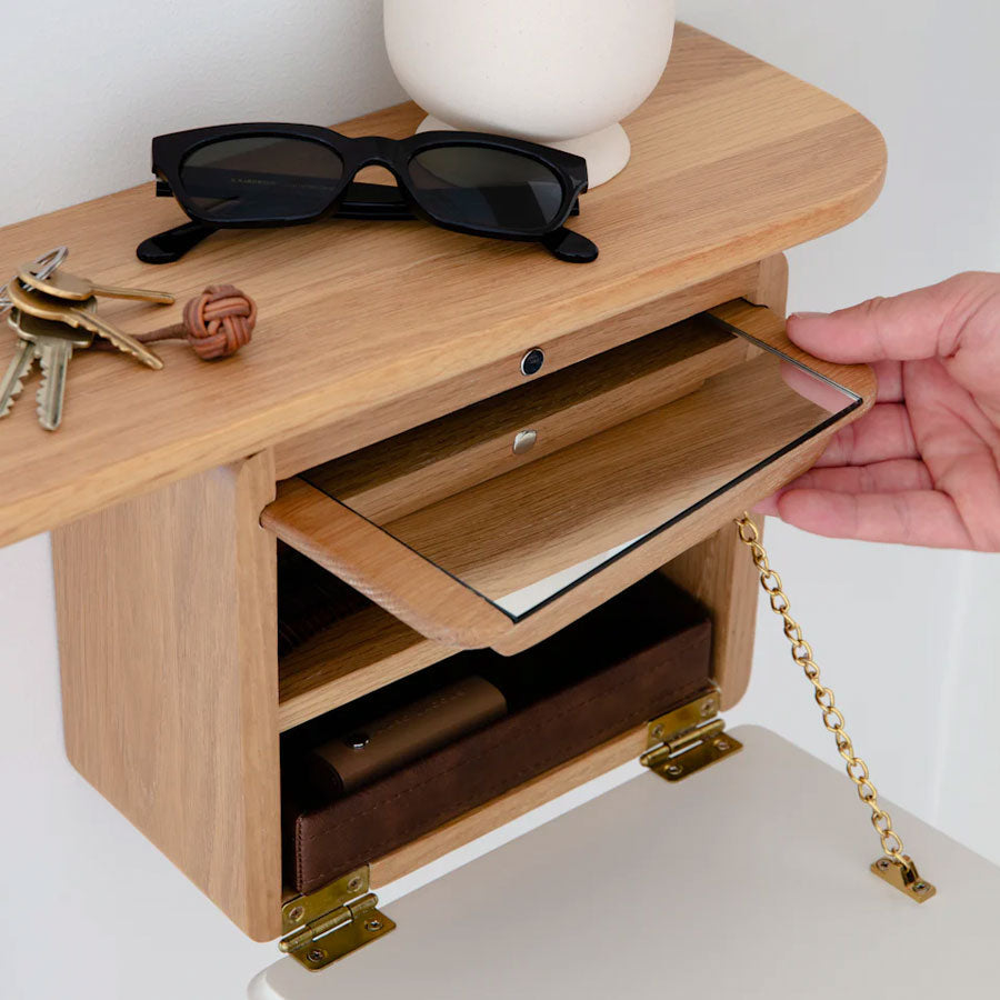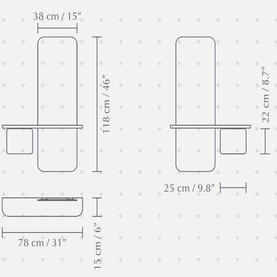 Det funktionelle One More Look spejl er en sand genistreg med sin integrerede hylde med en lille farverig skuffe nedenunder. I den lille skuffe finder du et håndspejl til at tjekke at makeuppen sidder som den skal inden du smutter ud ad døren. I skuffen finder du desuden en praktisk bakke i kunstlæder, der er oplagt som opbevaringsplads til nøgler og smånips.