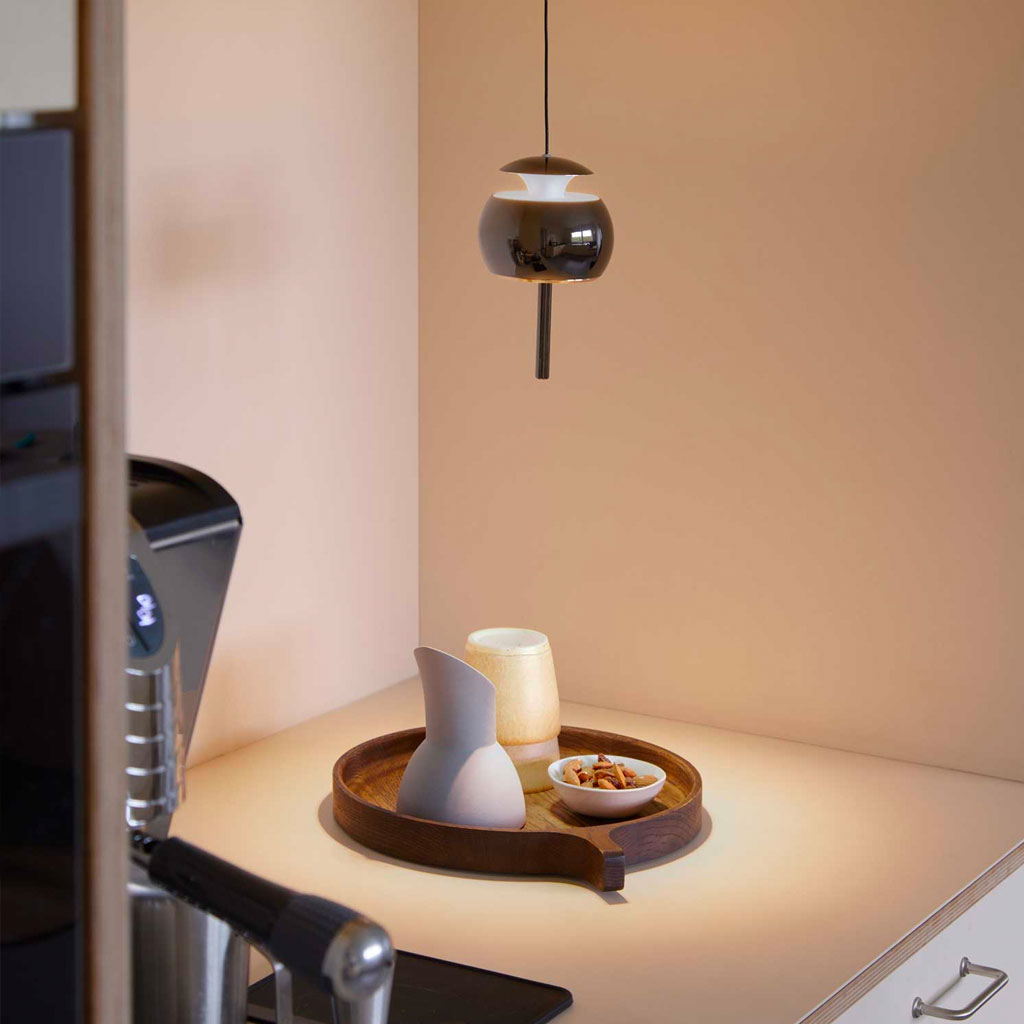 Parachute Sort er en elegant pendellampe i aluminium med sort look. Selvom pendlen er lille i størrelse, er den alligevel utrolig alsidig og iøjnefaldende. Parachute er f.eks. intelligent udformet, da den nemt kan højdejusteres helt op til en maks. længde på 180 cm – blot ved at trække i den.