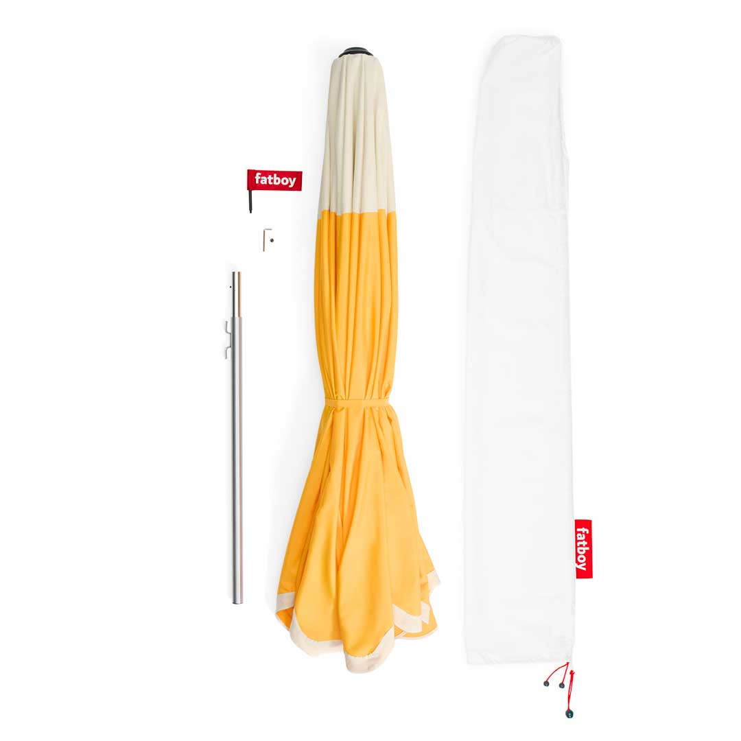 Pensol-parasollen kombinerer retrodesign med moderne funktionalitet. Med sine legende, bølgende flapper – inspireret af blyantspåner – bringer den et strejf af 60’erne til din have eller altan. Den rummelige dug med en diameter på 3,5 meter giver rigelig skygge og er fremstillet af farvebestandigt polyester, der er vand- og smudsafvisende. Derudover beskytter den dig effektivt mod solens stærke UV-stråler. Takket være den robuste aluminiumsramme står Pensol-parasollen stabilt, og den medfølgende beskyttelsespose samt det ikoniske Fatboy-flag fuldender det hele. Et blikfang og en funktionel solbeskytter i én.