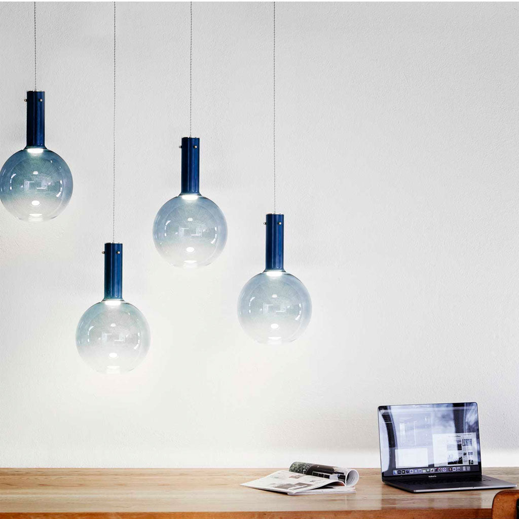 Raindrop 20 Blå er en smuk, dråbeformet glaspendel i blå med semitransparent bund. Glasset er håndblæst på fornemste vis, hvilket samtidig gør hver pendellampe unik. Den harmoniske form og det smukke, blå glas komplimenteres perfekt af en guldplade på toppen og guldskruer i siden, hvilket er med til at skabe en pendel med et ekstraordinært design og udseende.