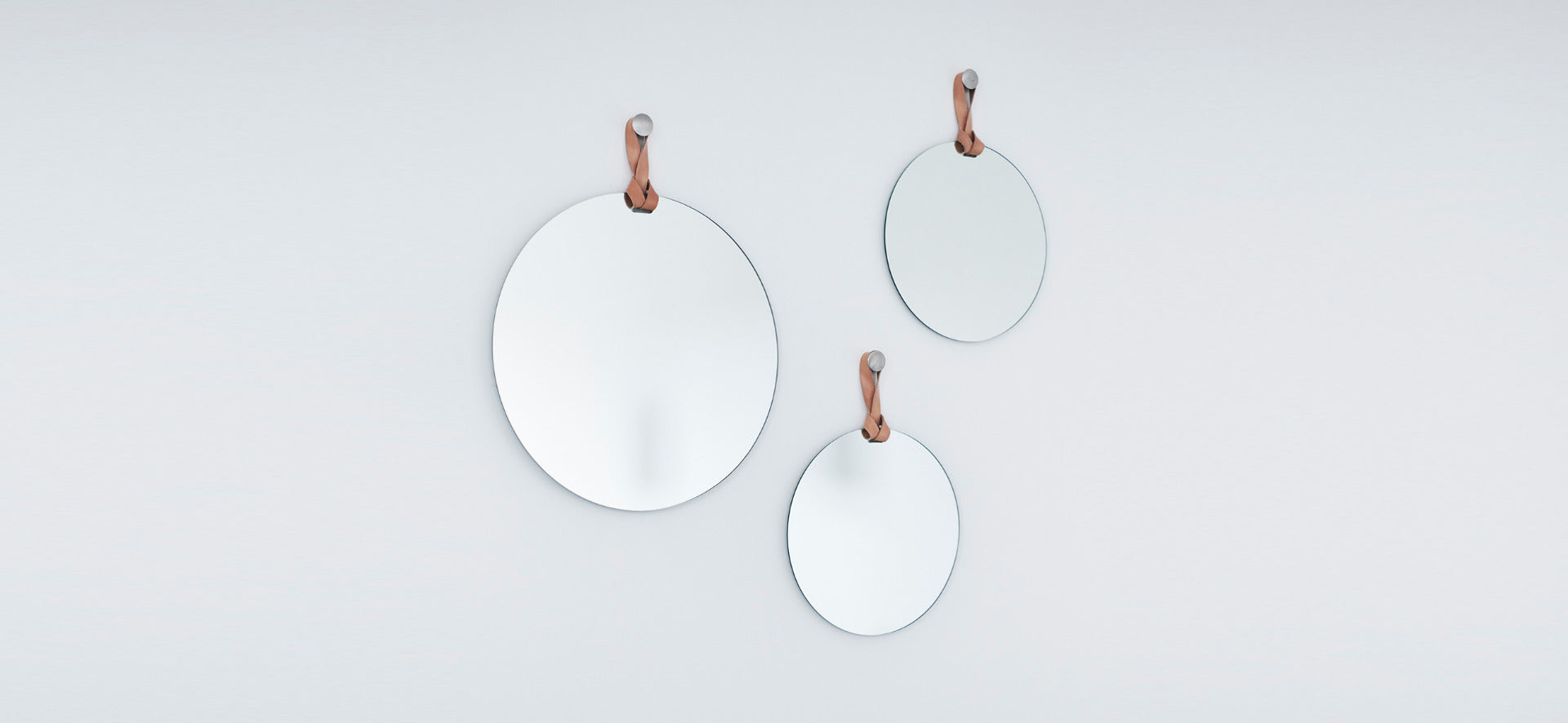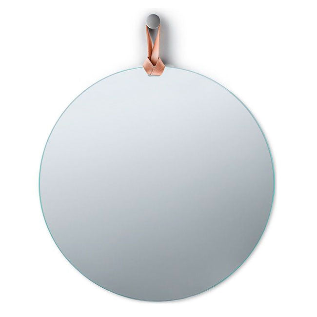 Rope Mirror er et rundt spejl, hvor der i den ene ende er bundet en kraftig læderstrop fast. Stroppen er udført i kernelæder og tilfører kant til det enkle og minimalistiske spejl.