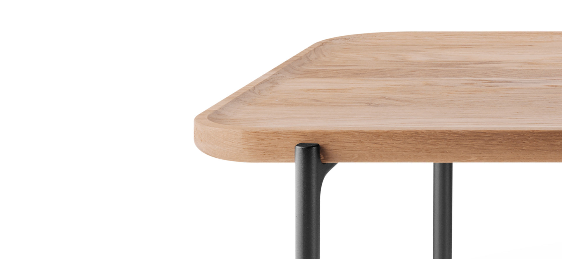 Eva Solo sofabordet har en udformning ved bordpladen, der minder om en bakke, men hvor kanten er rundet af på en måde, så krummer nemt kan tørres væk.