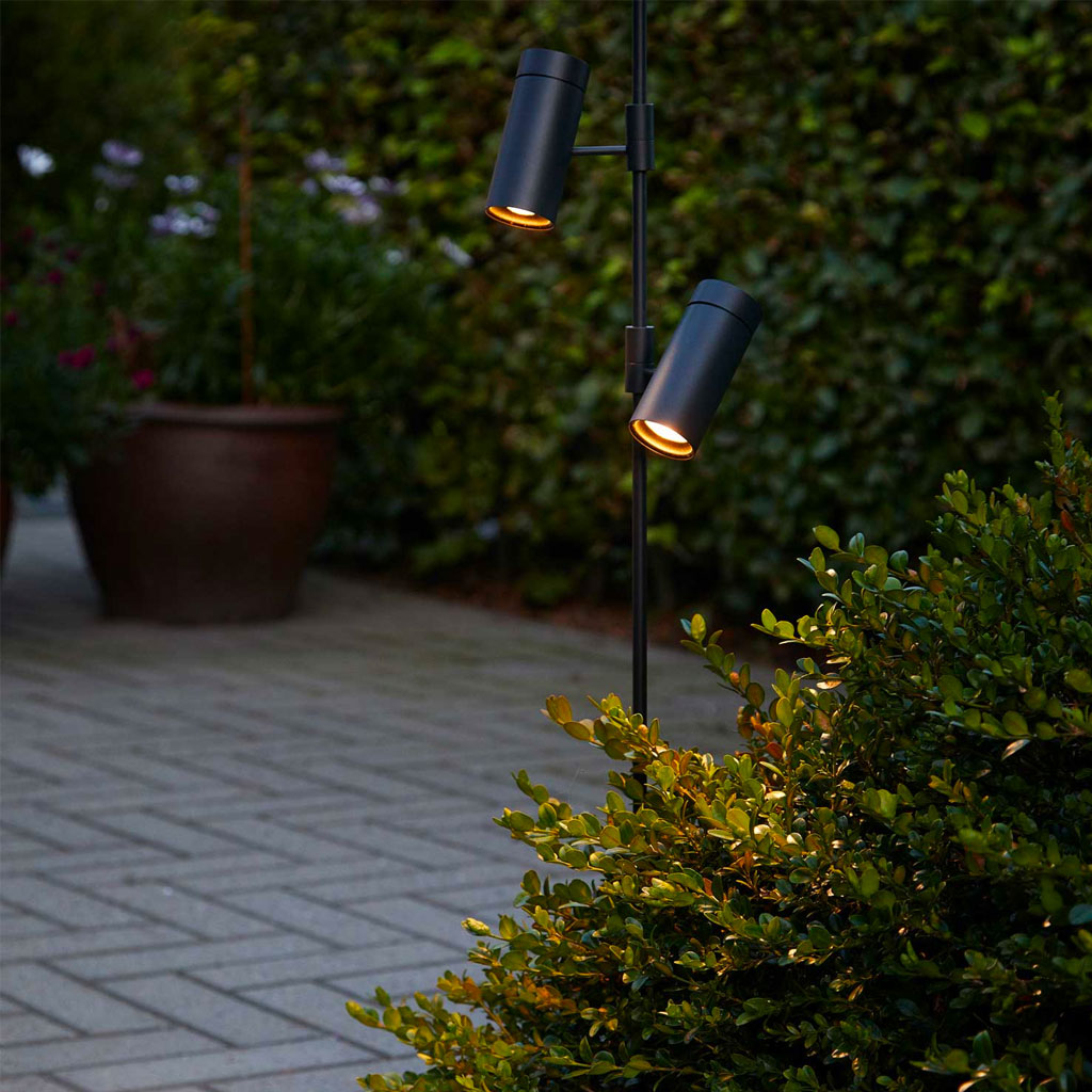 Sia Havelampe Sort er en havelampe på jordspyd i et stilfuldt og moderne design med to cylinderformede batteri-spotlamper. Lampen er lavet af trykstøbt aluminium og er med IP65-klassificering, der gør den ideel til at oplyse udendørsområder, f.eks. ved bed og træer eller omkring terrassen og indkørslen.