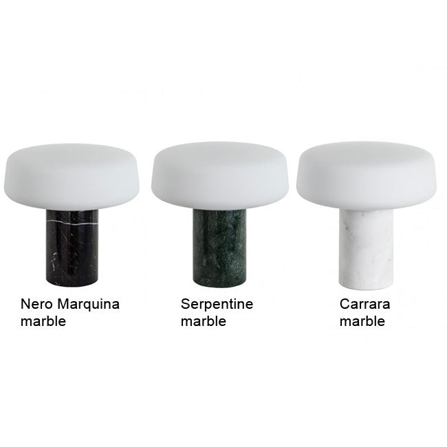 Bordlampen er fremstillet af massiv finpoleret marmor med en håndblæst opal glasskkærm.