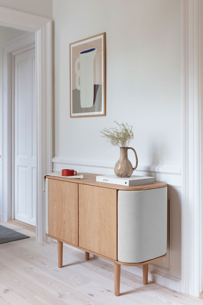 Treasures er et skab, der kan tilpasses efter dine behov. Skabet er lavet af fineret egetræ, og skabets sider har en justerbar beklædning, der giver Treasures et blødt taktilt touch.