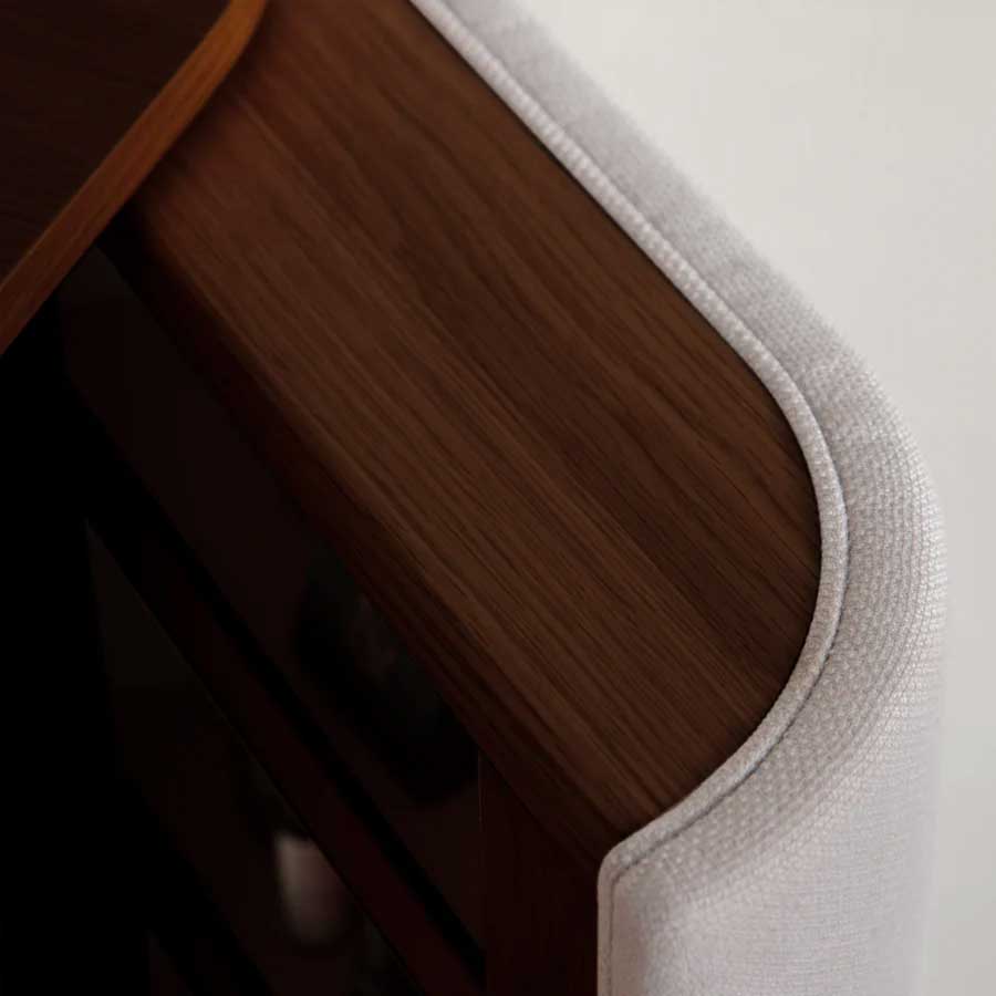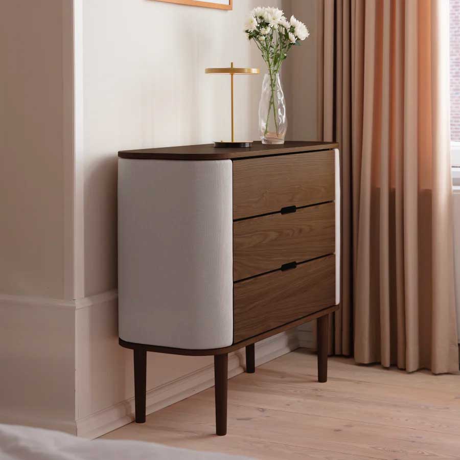 Treasures kommoden forener elegance og funktionalitet med sine let-kurvede sider og rummelige opbevaringsrum, der tilføjer en følelse af lethed til indretningen og designet. Dørene åbner som vinger og giver opbevaring til smykker og små minder, mens de tre skuffer giver god plads til striktrøjer, borddækning eller kontorartikler.