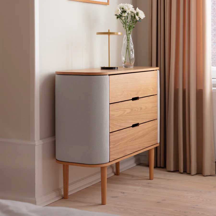 Treasures kommoden forener elegance og funktionalitet med sine let-kurvede sider og rummelige opbevaringsrum, der tilføjer en følelse af lethed til indretningen og designet. Dørene åbner som vinger og giver opbevaring til smykker og små minder, mens de tre skuffer giver god plads til striktrøjer, borddækning eller kontorartikler.