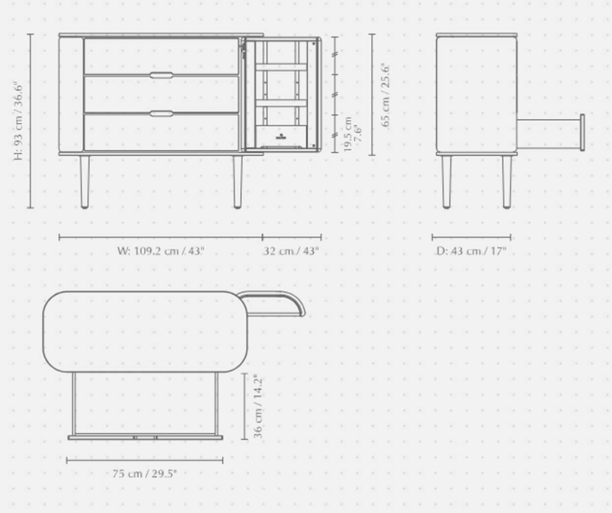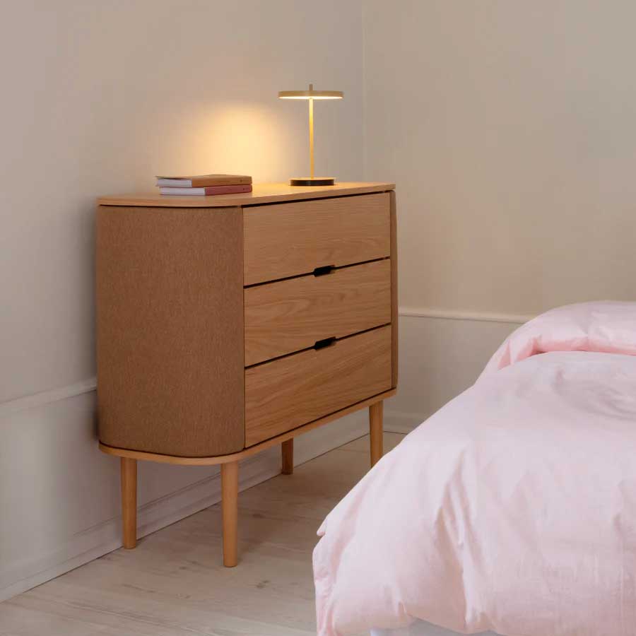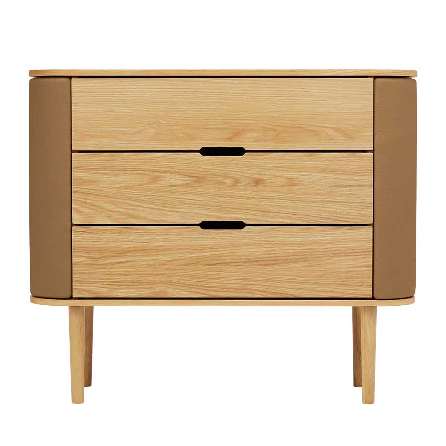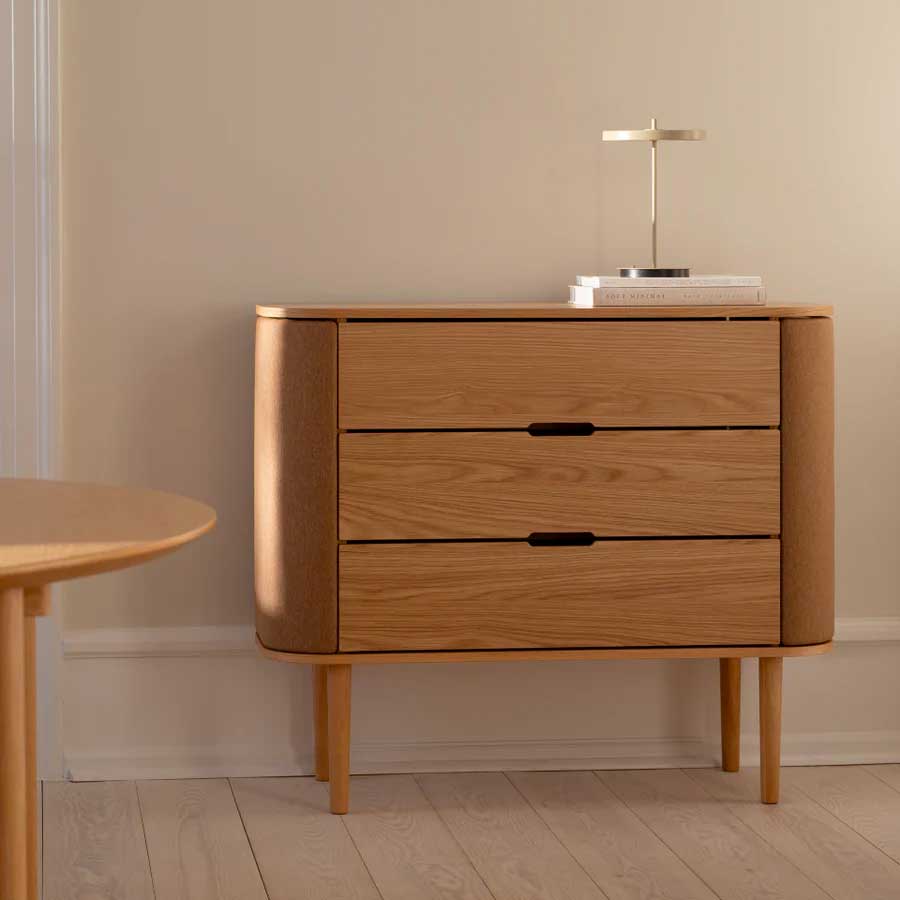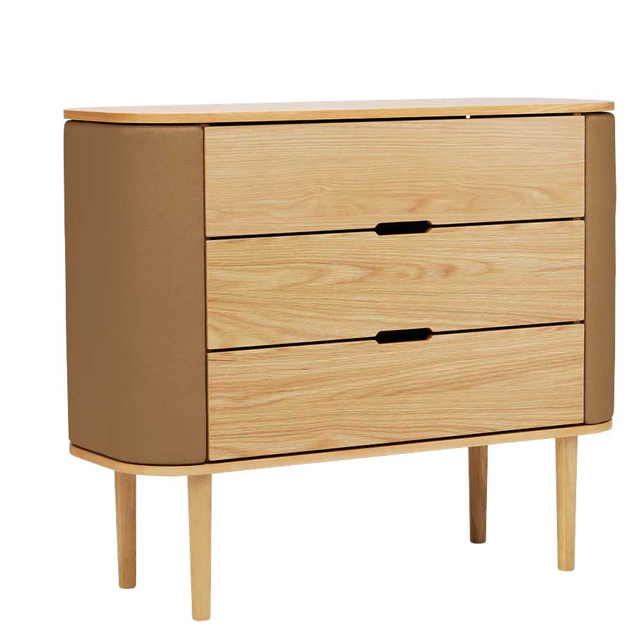 Treasures kommoden forener elegance og funktionalitet med sine let-kurvede sider og rummelige opbevaringsrum, der tilføjer en følelse af lethed til indretningen og designet. Dørene åbner som vinger og giver opbevaring til smykker og små minder, mens de tre skuffer giver god plads til striktrøjer, borddækning eller kontorartikler.