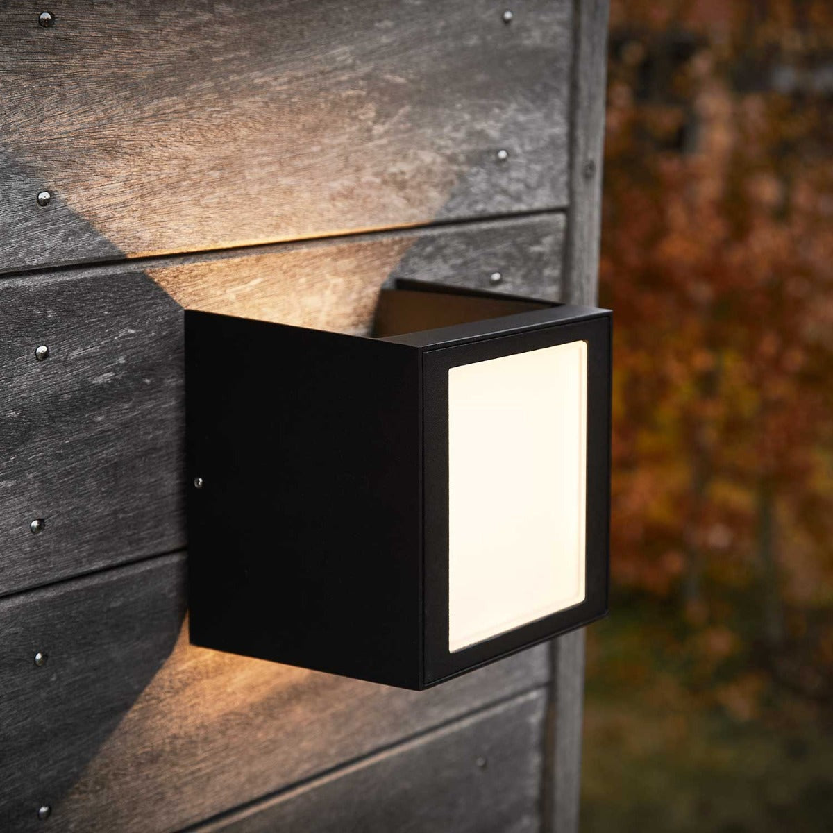 Una IP54 væglampen fra Loom Design udsender lyset så det skaber et spændende mønster på husets facade. Mønstret er lavet af lampens to rotationspaneler, der sidder foroven og forneden på lampen, og som giver dig mulighed for at ændre på lysets to strålevinkler fra 0-100° opad- og nedadrettet.