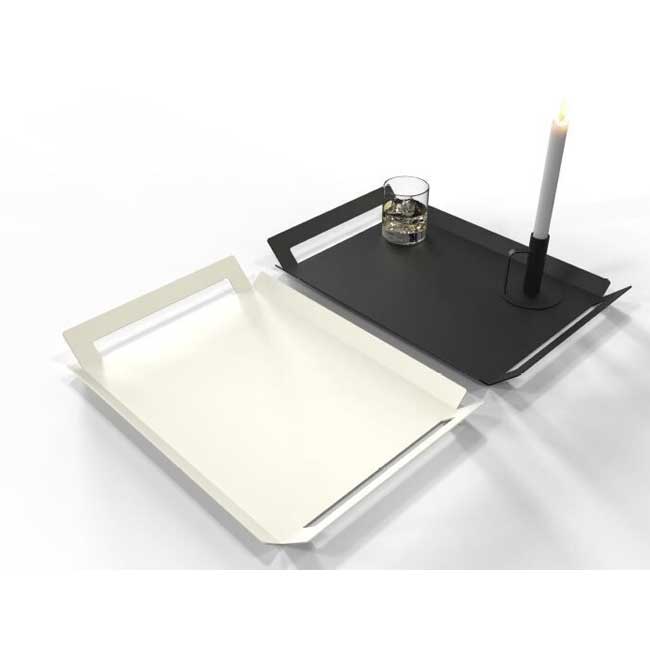 Serveringsbakken fra Forst Design er fremstillet i aluminium og fås i sort og i hvid.