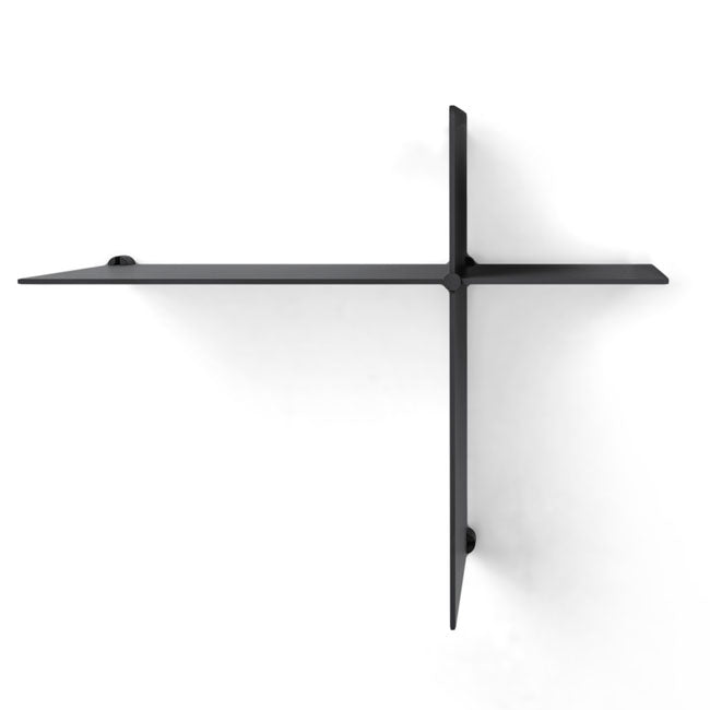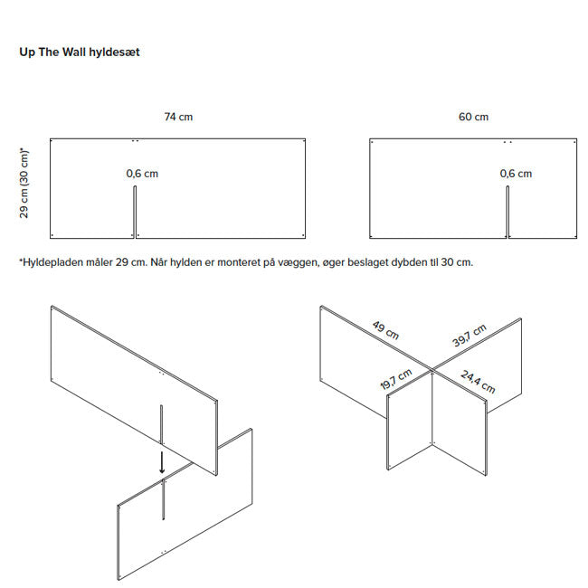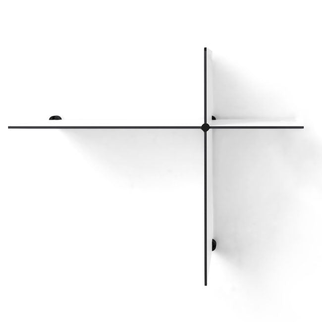 Hylderne kommer i en pakke med en kort og en lang hylde, der tilsammen danner et asymmetrisk kryds.